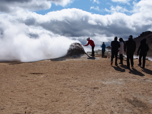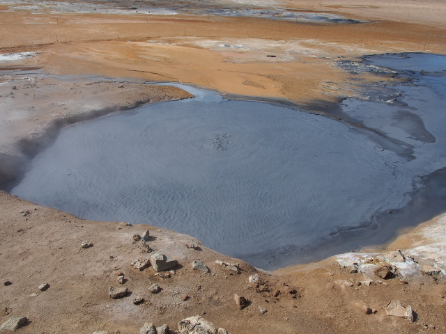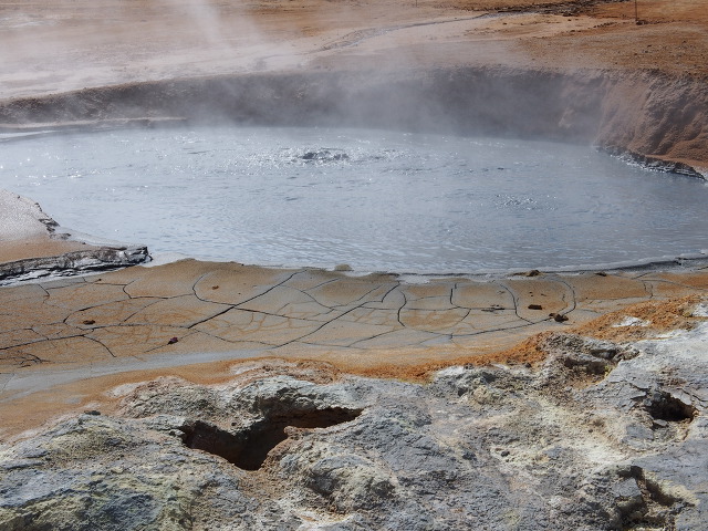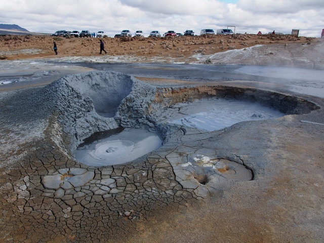 하얀 증기와 검은 머드가 팥죽끓듯이 푹푹 솟구쳐 오른다.