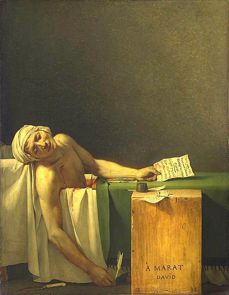 [사비니 여인의 강탈]The Rape of the Sabine Women,1637-38 그가 호라티우스의 삼형제의 맹세를 주제로 그림을 그리기로 결정한 얼마 후에 니콜라 푸생Nicolas Poussin(1594-1655)의 그림 <사비니 여인들의 납치, 1636>(그림73-2)를 보게 되었다. 다비드는 푸생의 고전건축을 배경으로한 박력있는 납치장면에도 감명을 받았다. 신전 계단에서 로마인들에게 납치의 신호를 하는 총 지휘자 로무로스의 인물묘사에 큰 매력을 느꼈음에 틀림없다. 그리고 푸생의 그림과 경쟁할 수있는 <사비니 군의 공격에 뛰어든 여인들>(그림 73-3)을 그렸다. 다비드의호라티우스는 푸생의 로무로스를 모방 개작한 것을 알 수 있다. 팔의 제스처는 바꾸었지만 내디딘 두 다리와 붉은 토가(로마인의 복장은 거의 그대로 모방된 것이다. (그림 73-3)[사비니 여인들]The Sabine Women. 1799 사비니의 여인들의 납치는 리비Llvy, 프르타르크Plutarch, 오비드Ovid에 나오는 이야기로 로마 초창기에 인구성장을 위해 축제에 초대된 사비니 처녀들만 로마인들이 납치하고 남자들은 국외로 추방했다. 3년후에 사비니의 남성들은 보복공격을 했다. 그러나 로마인들의 아내가 된 여인들은 다비드의 <사비니군의 공격에 뛰어든 여인들>(그림 73-3)에서 보는 바와 같이 남편과 친정아버지와 오빠들 사이에 자기 자식들을 던지며 전쟁을 막아 평화를 이끌었다는 이야기이다. (그림73-4)[마라의 죽음]Jacques-Louis David. Death of Marat. Oil on canvas. 1793. 다비드의 혁명동지였던 장 폴 마라Jean Paul Marat는 피부병 때문에 목욕탕에서 안정을 취하다 샤를로트 코르테라는 여인에게 살해당했다. 그래서 다비드는 친구의 갑작스런 피살을 그의 그림 <마라의 죽음>(그림73-4)에서 추도했다. 마라는 나무상자 같은 궤짝에 잉크병을 놓고 집필하다 쓰러진 순교자처럼 선명하게 그려졌다. 넘어진 마라의 시체와 침울하고 차게 느껴지는 벽은 몸서리쳐지는 살인의 비극성을 폭로한다. 그의 한손에는 면회를 요청할 때 샤를로트 코르테가 가지고 온 피 묻은 청원서가 아직도 들려 있고, 다른 손에는 깃펜이 쥐여진 채 마라는 가슴을 난자당해 피를 흘리며 죽어 있다. 목욕탕 바닥에는 상아의 칼이 피 묻은 채 놓여 있다. 그는 목욕 중에도 혁명과업을 완수하려다가 죽은 열사처럼 모사되어 있다. 투명한 잉크병이 놓인 낡은 궤짝에는 마치 비문처럼 마라에게 다비드가 바친다.A MARAT,DAVID'라는 글이 쓸쓸하게 씌어 있다. 다비드는 마라를 예수와 같은 순교자로 묘사했다. 그의 목욕탕은 아무 것도 없는 청렴한 애국자를 나타내듯 장식이 없이 그려졌다. 그는 마라의 팔을 미켈란젤로의 [피에타], 라파엘로의 [십자가에서 내려지는 예수]에서 보이는 늘어진 예수의 팔처럼 그렸다. 또한 순교자 마라의 손과 가슴에는 상처 자국이 있으며. 머리에 감은 흰 수건과 담요 외에는 가진 것이 아무 것도 없다.
