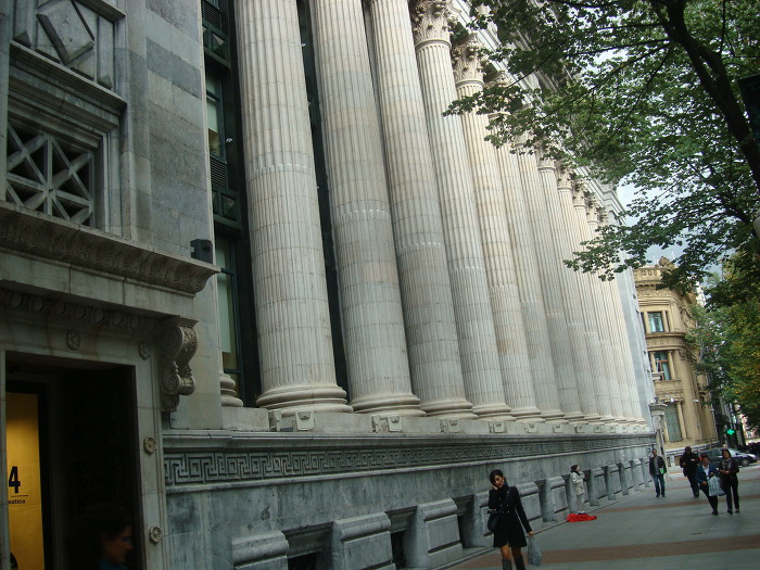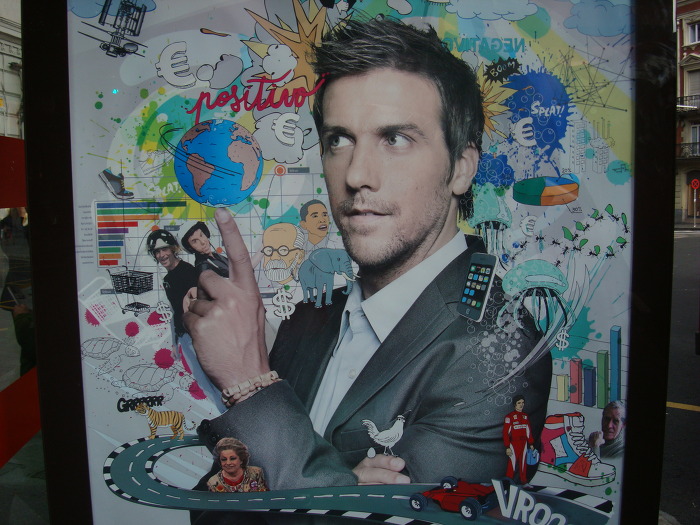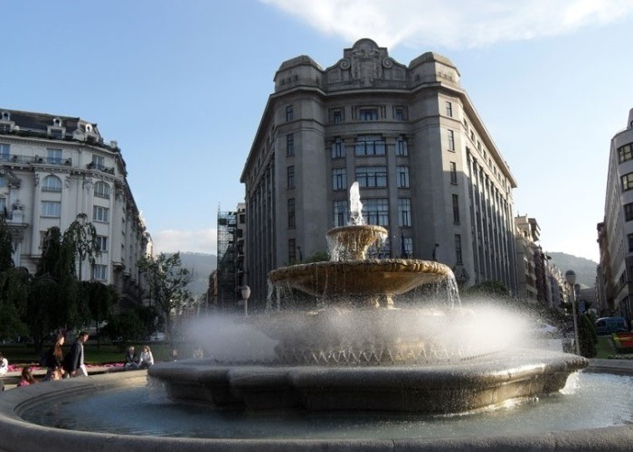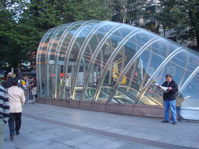 하늘 높이 솟은 기념탑을 거쳐 Granvia don Diego 거리 를 걷습니다.