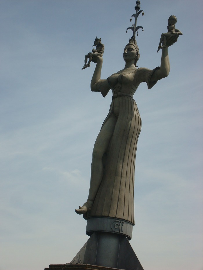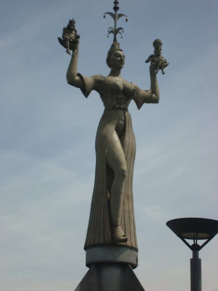 선착장 방파제 에는 엄청 크고 높은 여신상 이 서 있는데 양 손에 들고
