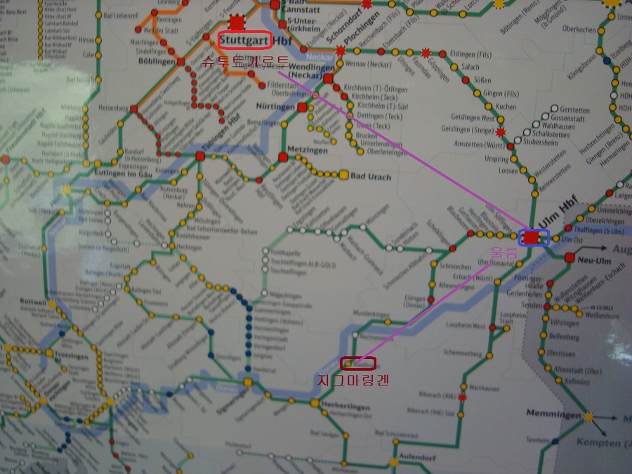 바로 가는 기차가 없으니 Immendingen 과 울름 Ulm 역에서 기차를 갈아타야 하네요?