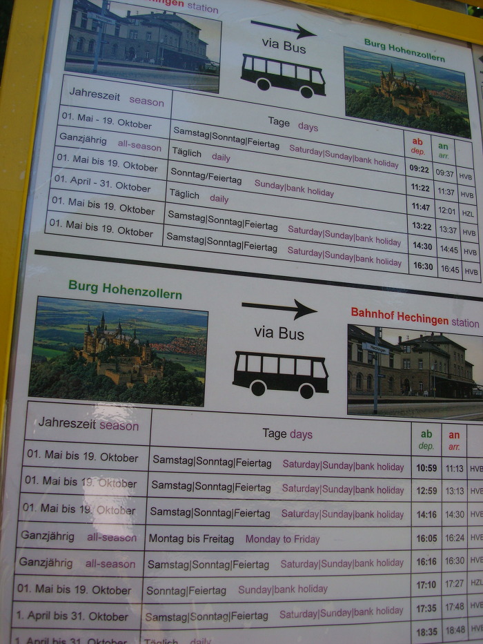헤힝겐 기차역 에서 여기 성으로 오는 버스는 평일은 11시 22분과 13시 22분에 있고