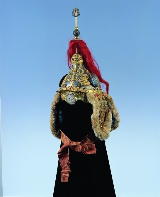 봉황이 금빛으로 새겨진 붉은 털머리에는 푸른 보주와 화염무늬가 위엄있는 투구 12점에...