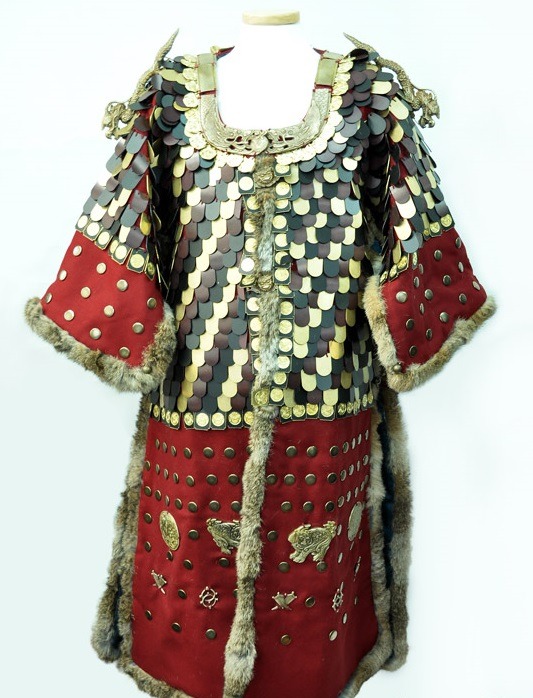 어깨에 올려진 융으로 짜서 장수의 용맹한 기상이 느껴지는 조선 갑옷과 용과