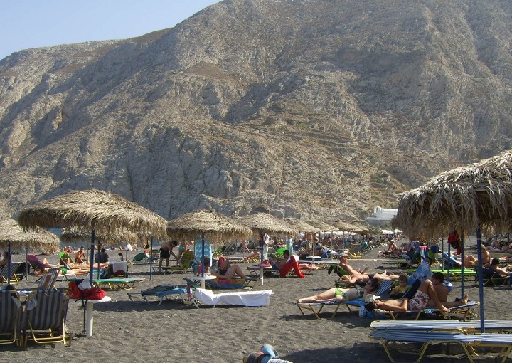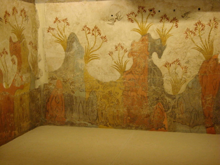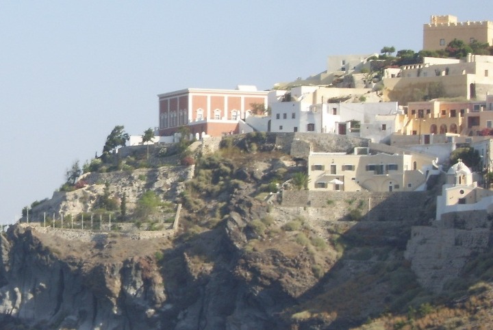 BC 1,500 년경 화산이 폭발하여 중앙부가 침몰하고 나머지도 저처럼 절벽인데 사람들은