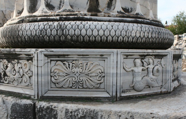그래도 신전에 남은 높이 솟은 기둥 위에 양머리 처럼 밑으로 감긴 이른바 이오니아식의