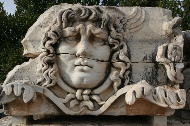 그러고는 벽에 튀어나온 양머리 장식 과 또 메두사의 머리 를 보는데..... 원래 고르고의