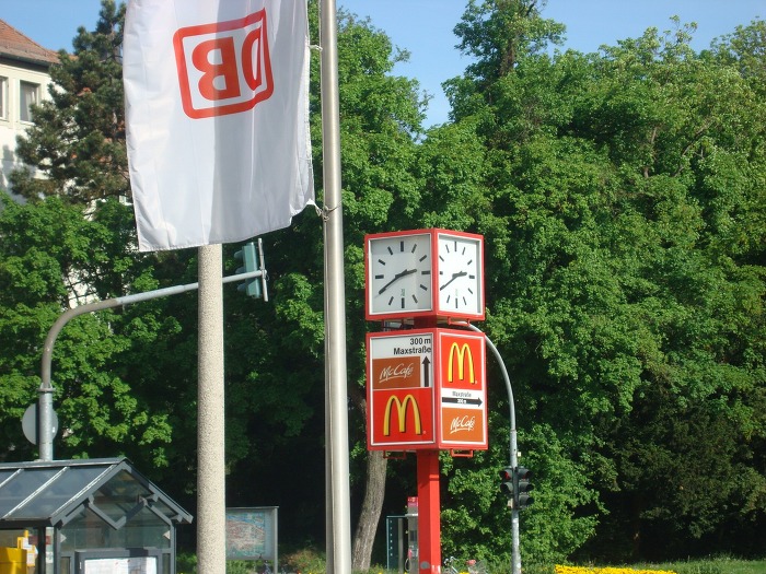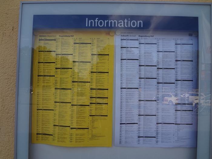역 로비에 게시된 전지 크기 황색종이 Abfahrt ( 영어로는 Departure ) 에서 출발시간