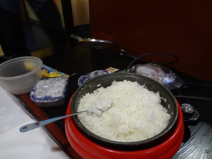 호텔로 돌아와 마눌이 지은 쌀밥 을 먹는데 김과 고추장에 멸치와 오징어 포 반찬 외에