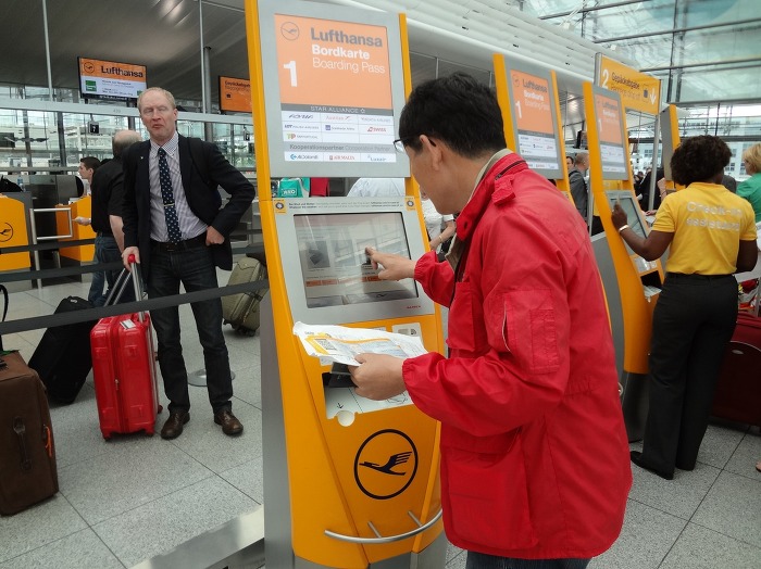 공항 독일항공 루프트한자 부스 에 체크인을 하려니 안내원이 입장을 제지 하면서 무인