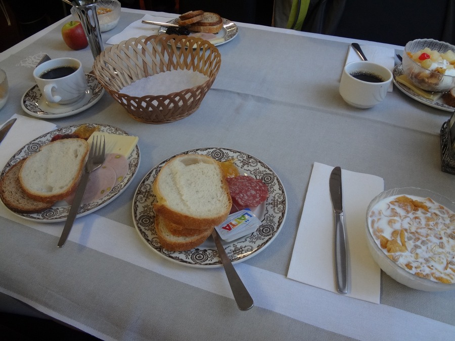 일어나 레스토랑으로 내려가서는 뷔페식 아침 을 먹는데 질과 양 모두 훌륭합니다!