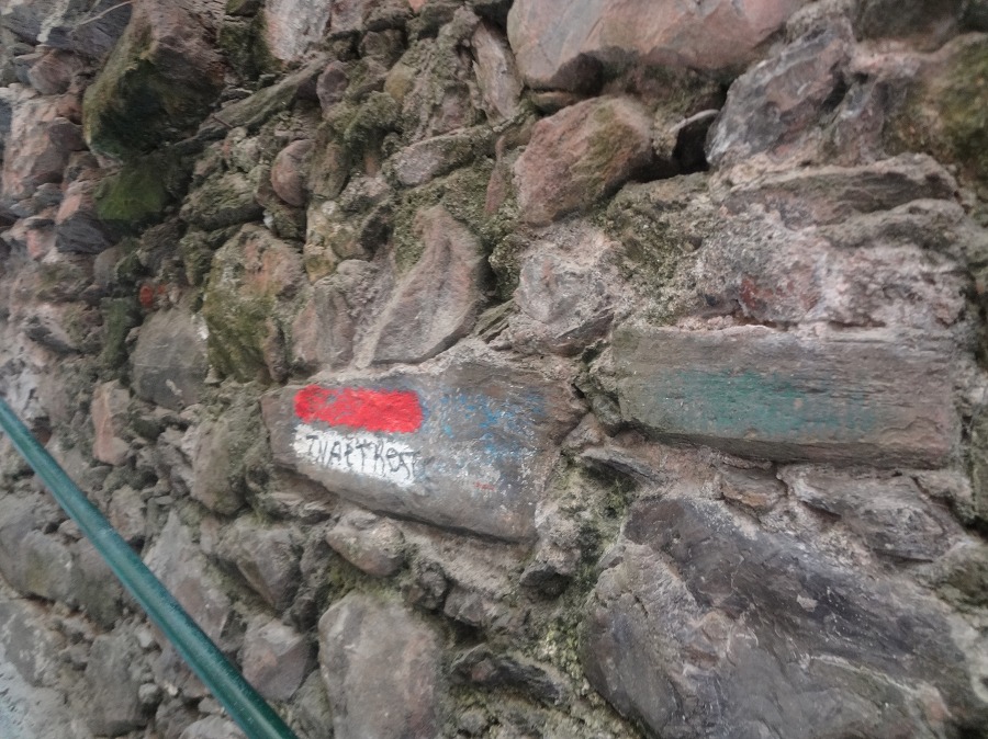 붉은색과 흰색 두줄 의 페인트가 칠해진 친꿰테레 도보 산책길 표시 를 발견합니다.