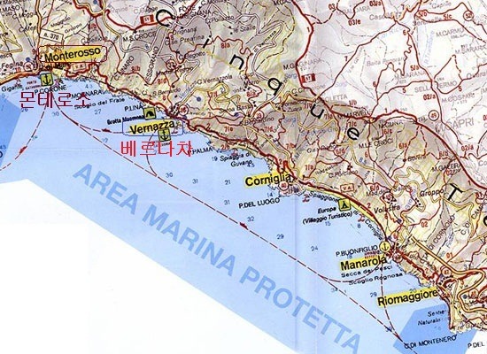 5마을 여정은 몬테로소 Monterosso - 3.8km 도보 2시간 - 베르나차 Vernazza -
