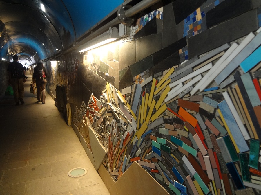 터널 벽에는 색색의 돌을 잘라 붙여 무슨 모자이크 를 이루었는 데