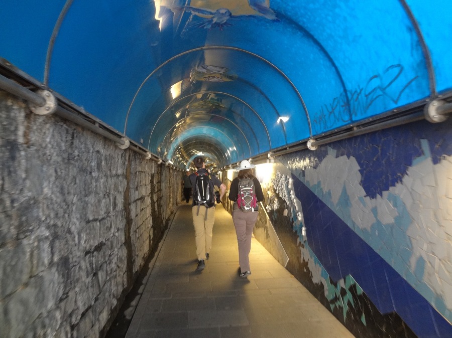 배낭을 메고 터널로 들어가니 푸른색 아치형 천장 이 묘한 분위기 를 나아내는