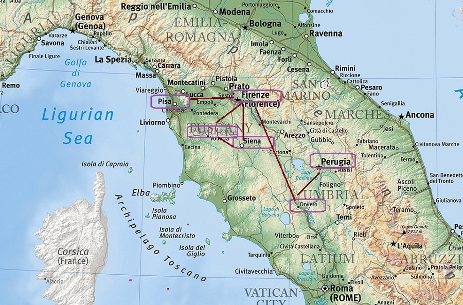 남쪽으로 직진해 험한 아펜니노 산맥을 넘어 토스카나지방의 피렌체 로 내려옵니다.