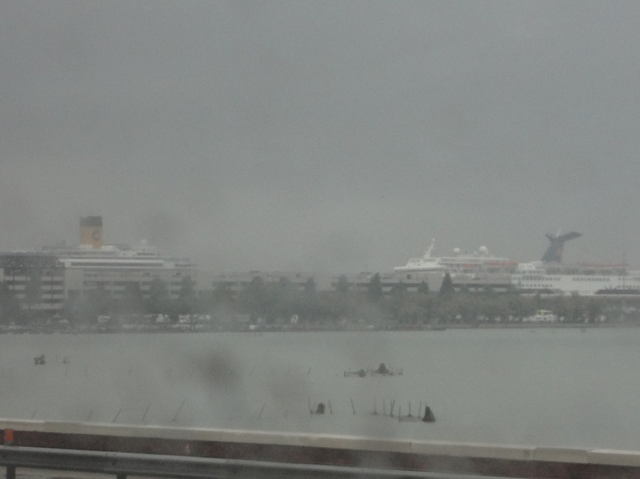 놓인 긴 다리 를 지나 베네치아 섬 으로 들어가는데, 건너편으로 유람선 이 보입니다.