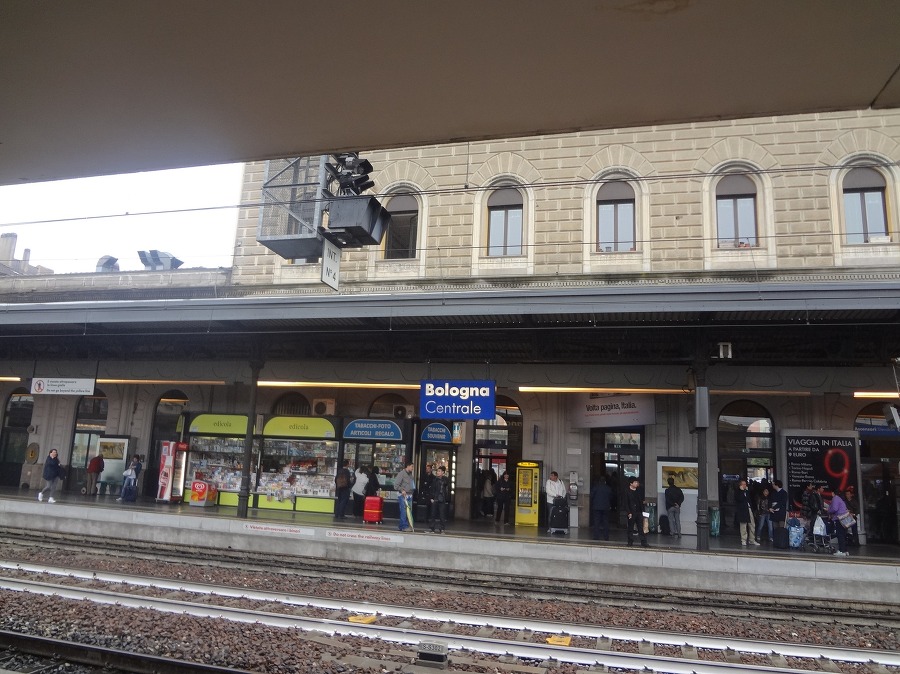 그러고는 배낭을 메고 건물의 주랑 아래를 걸어서 볼로냐 역 Bologna Centrale 에 도착해서는
