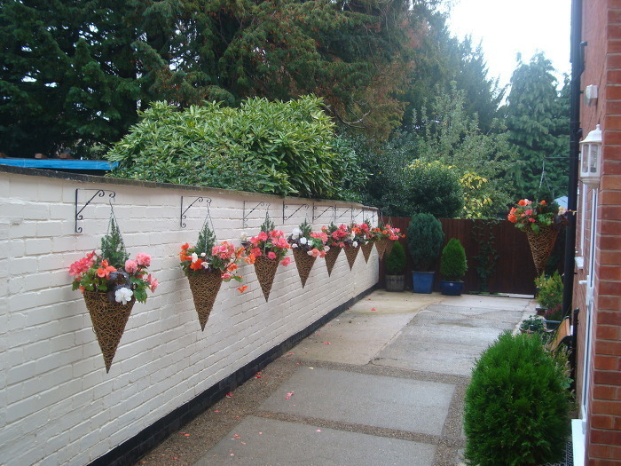 에는 역삼각형으로 된 나무 화분에 붉은 꽃 들이 참 예쁘게도