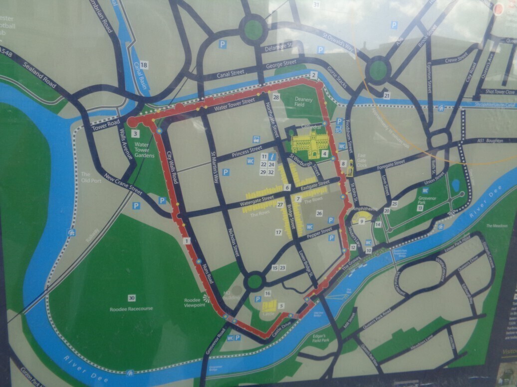 시계 반대방향 으로 성벽을 한바퀴 돌면 노스게이트, 워터타워, 워터게이트, 체스터성
