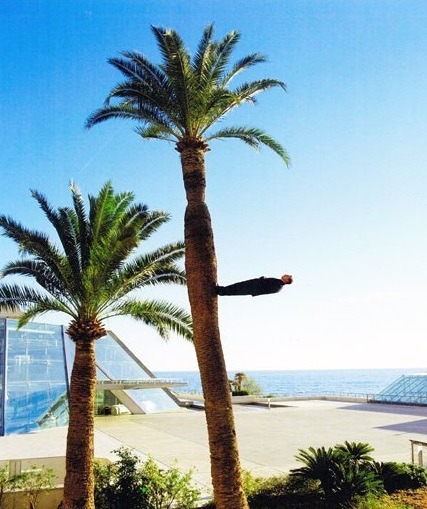 초능력의 남자 는 검은 양복에 넥타이를 맨 단정한 차림으로 야자수 나무기둥에 발을 딛고