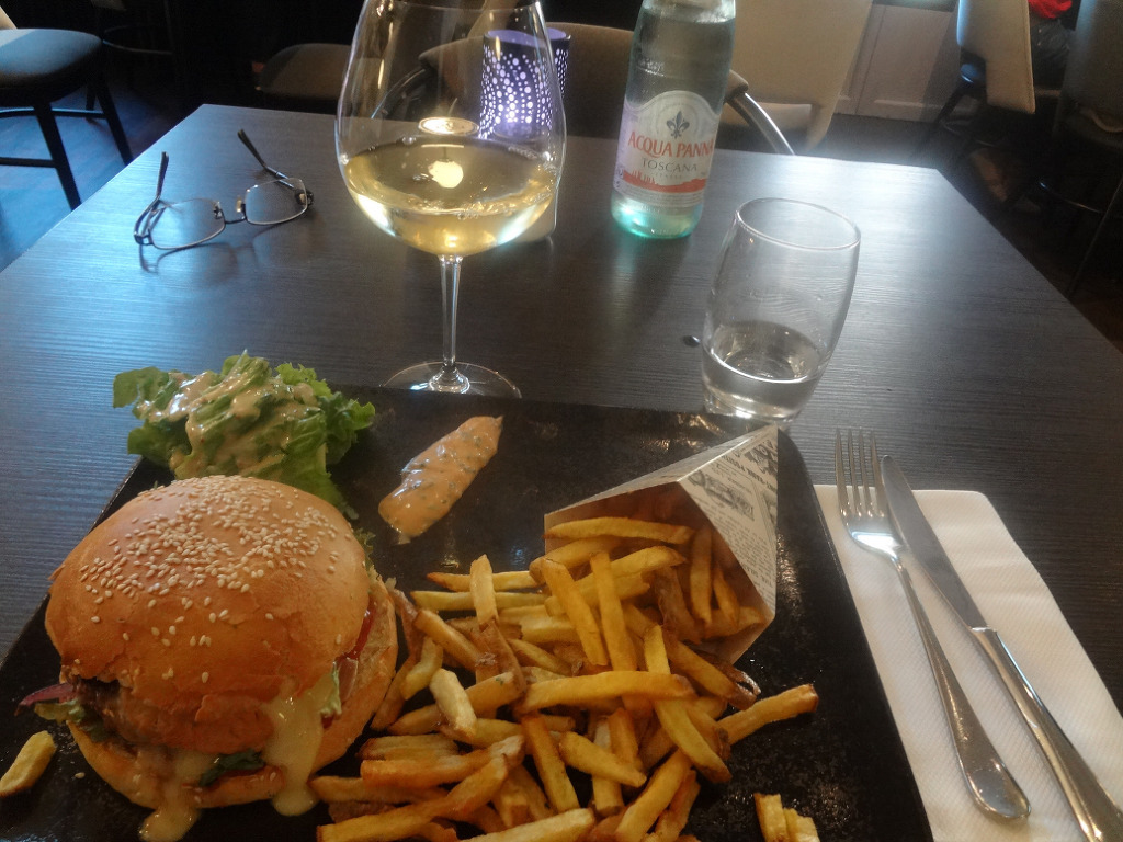 시키지 싶은 메뉴인 햄버거 를 주문하고 와인 중에 하나를 골라 글라스로 한잔 을 시킵니다.