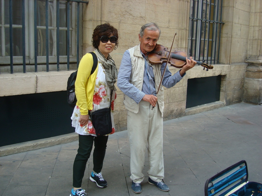 거리의 악사 가 바이얼린을 연주 하고 있기에 조금 듣고는 1유로 동전을 내는데.... 부산의