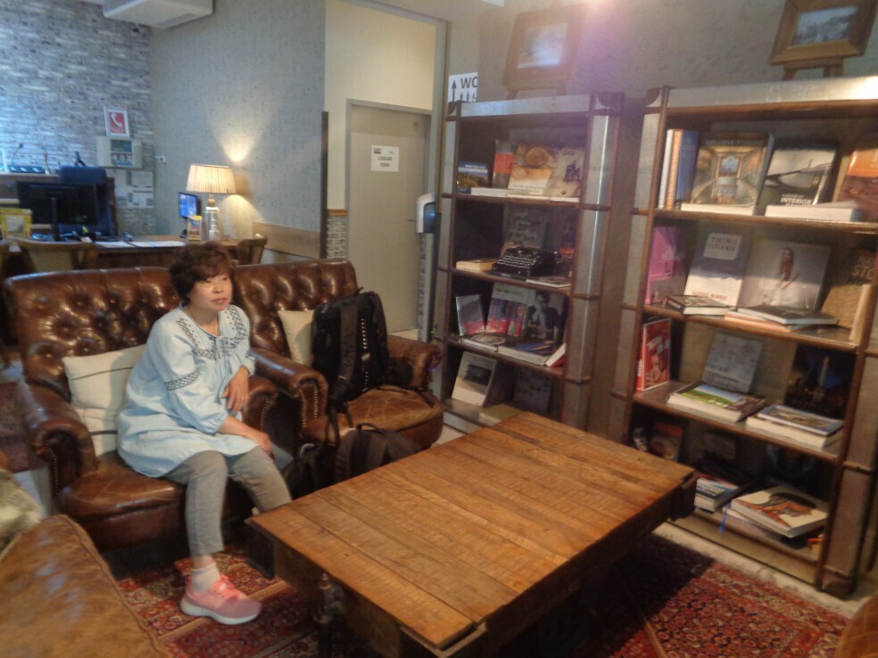 책장 이 참 고풍스러운데 여행 안내 책자들이 많이 보입니다.