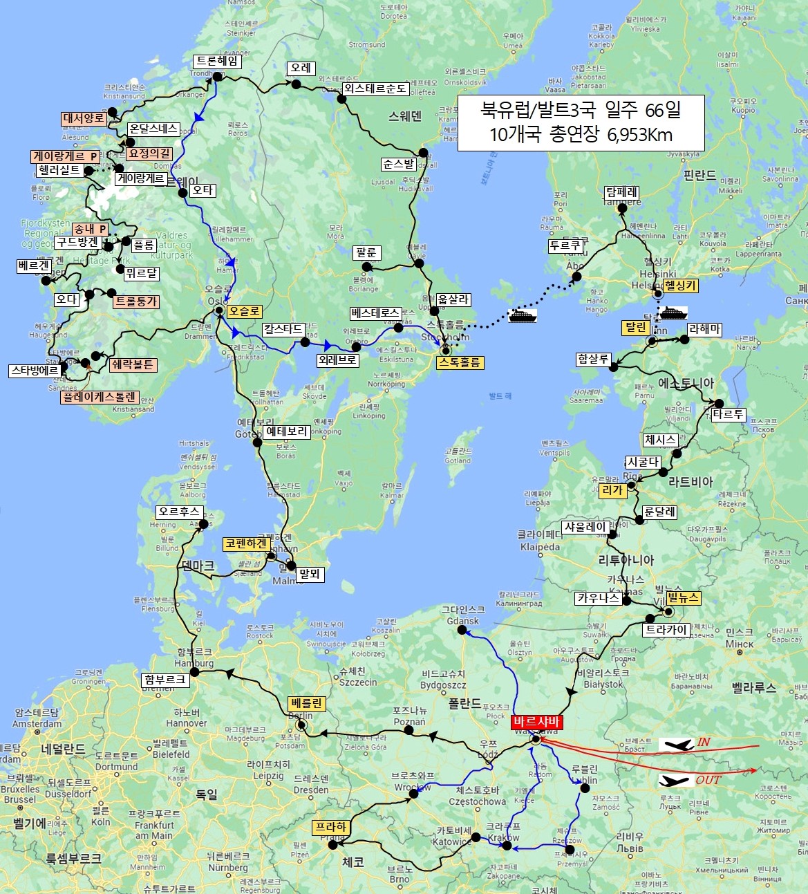 구글맵에 북유럽 유명 관광지를 체크해 보고 유명여행사의 패키지 경로를 종합해서 분석하고 고민하다 북유럽 중 물가가 가장 저렴한 폴란드 바르샤바에서 자동차를 렌트해서 발트해를 중심으로 한 바퀴 돌기로 결정.(북유럽 국가 중 자동차 렌트비용이 폴란드가 가장 저렴. 노르웨이의 1/3~1/4 수준)