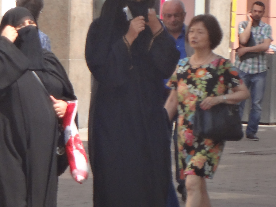 차도르를 쓴 아랍계 여인 을 만나 사진을 찍을려고 카메라를 만지작 거리며 망설이다가