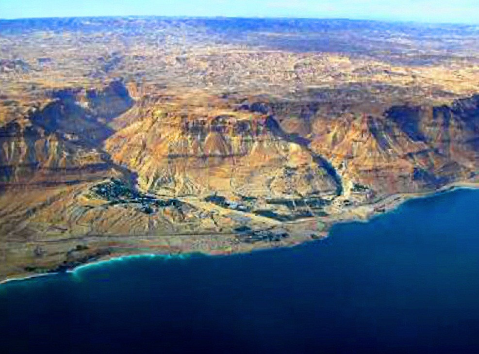 왼쪽으로는 사해가 나타나는데 오른쪽으로 보이는 바위산의 여러 동굴들이 보이니