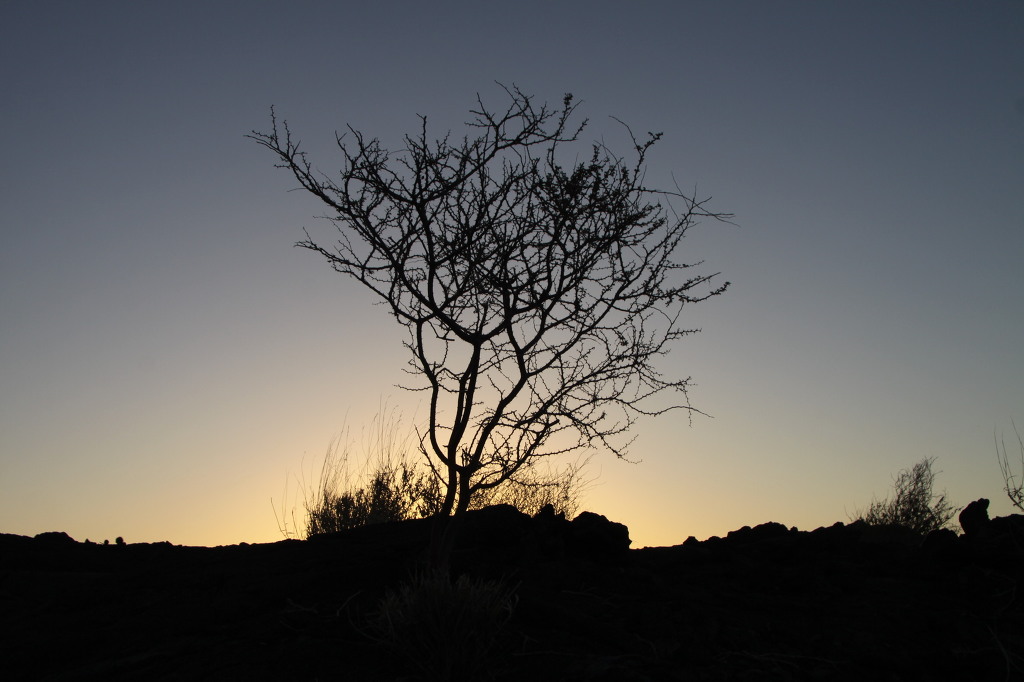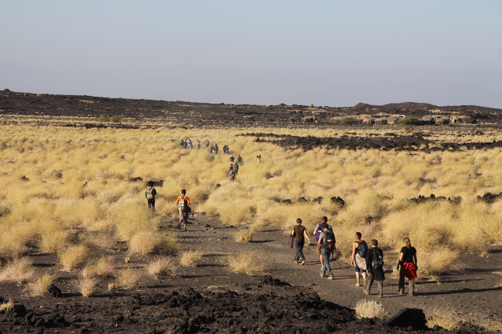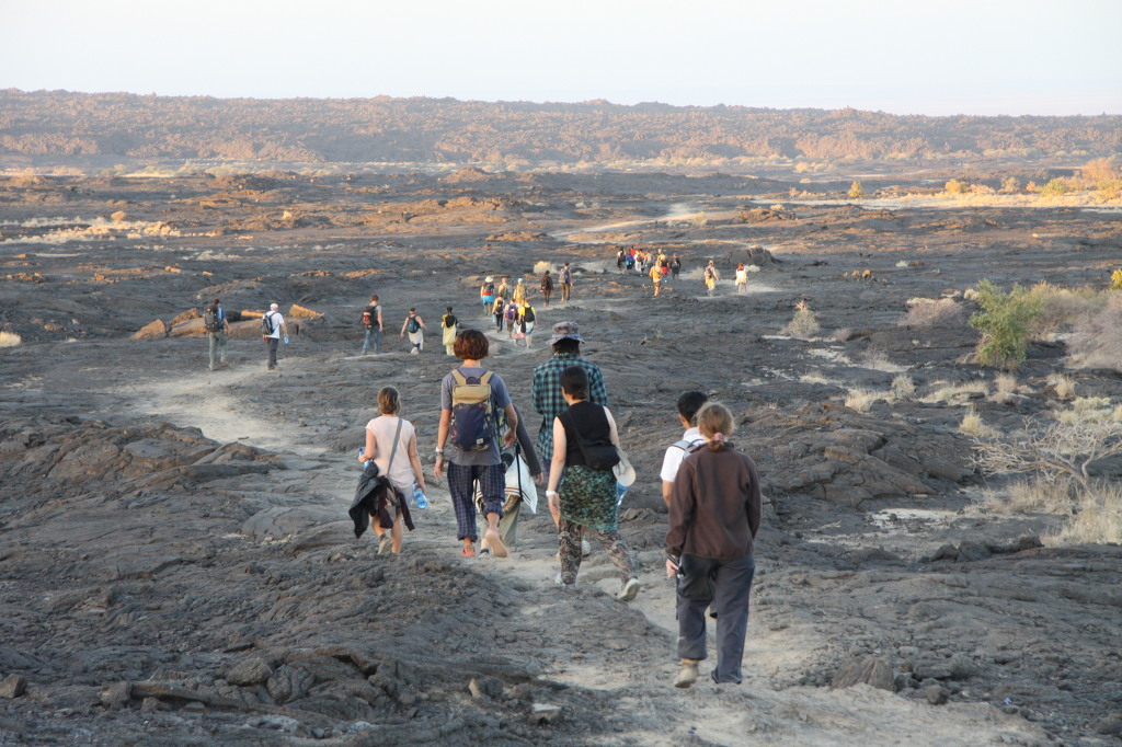 1시간 정도를 더 걸어가니 또 휴식이다. 이번에는 그늘에서 쉬어야한다. 막 떠오른 태양이 벌써 뜨겁다. 약간 떨어진 나무에는 낙타 한 마리가 잎을 따 먹고 있다. 잎도 초록이 아닌 단풍든 노란색이다. 그늘에서 모두 휴식을 취하는데 모두 생생하다. 주변을 살펴보니 용암이 흐르다가 급격히 식은 모습이 바위 모양을 이루고 있다. 바위들 사이에는 간간히 나무도 자라고 있다. 다시 출발한다. 베이스캠프에 가까이 오니 모래밭이다. 거기에는 색이 노란 덤불이 가득하다. 아침 햇살에 비쳐 덤불이 금빛으로 빛나고 그 사이를 걸어가는 사람들이 조화를 이뤄 보기 좋다. 무척 뜨거워졌다. 아내와 양산을 쓰고 걸어간다. 모두들 손에 물을 한 통씩 들고 간다. 베이스캠프가 보인다.