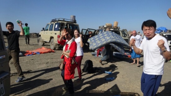 베이스캠프에 도착하니 아침 8시 30분이다. 어제 3 시간 만에 올라간 길이 돌아올 때는 2시간 30분이 걸린 것이다. 잠시 앉아서 쉬니 아침 식사가 준비되었다. 식빵에 계란 스크램블 그리고 커피와 수박, 오렌지다. 맛있게 잘 먹었다. 앞으로의 일정은 사해바다 같이 소금호수에서 수영을 체험하고 핫 스프링에서 수영하는 것이다. 이스라엘과 요르단의 국경에 있는 사해바다는 해발 –400m 이고 이곳은 평균 해발 –100m이다. 이것으로 3박 4일의 투어는 모두 끝이 나는 것이다. 오후 5시경에 메켈레로 돌아갈 예정이다.