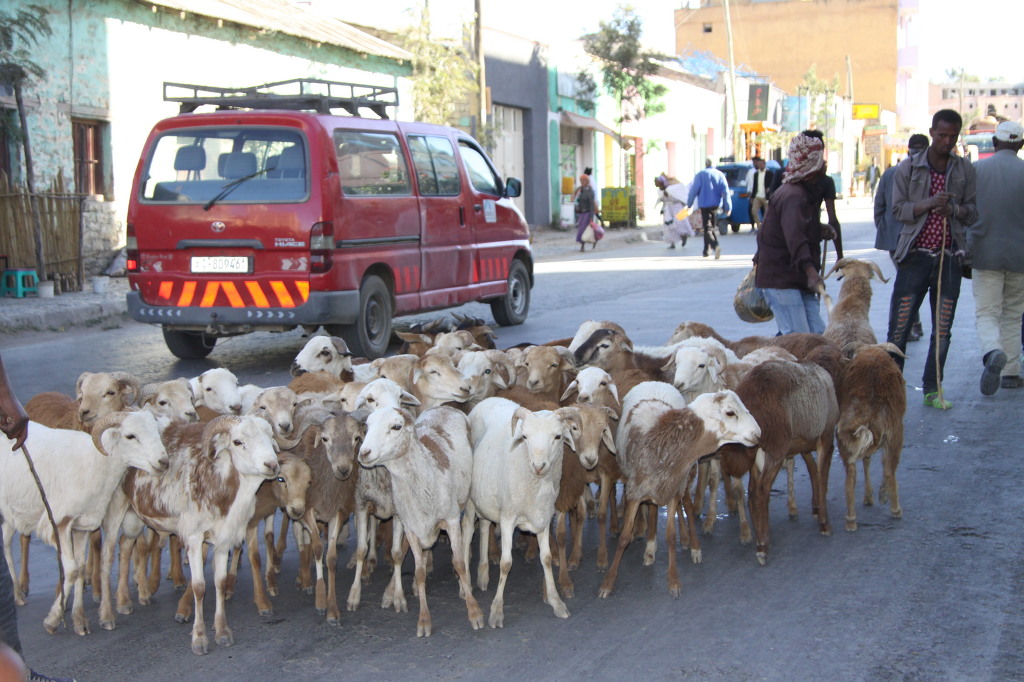 ETT 사무실로 다시 걸어오니 차량이 와 있다. 4륜구동의 지프다. 운전사가 제비같이 생긴 총각이다. 식사를 못했다고 식사를 하고 간단다. 우리를 태우고 시내로 가서 길가에 차를 세운다. 덕분에 우리는 시내를 구경한다. 양떼를 몰고나온 사람이 큰 길에서 쩔쩔매고 있다. 긴 막대기에 커다란 닭을 4마리, 다리를 묶어 어깨에 걸고 가는 사람도 만난다. 제법 거리는 복잡하다. 빌딩들도 보인다. 기사는 잠시 후에 나오더니 이제는 은행을 찾아간단다. 돈을 인출하려는 모양이다. ATM기계에서 돈이 나오지 않아 시내를 돌아다니게 되었다. 이렇게 시간을 보내다가 별로 좋지 않은 맘으로 차는 출발했다. 아내와 단둘이 타고 간다. 우리가 계약한 투어비에 악숨까지 이동시켜 주는 비용도 포함되어 있다. 내일 가도 되는데 악숨의 숙소를 예약해 놓았고 또 시간도 벌기 위해 오늘 가기로 한 것이다.