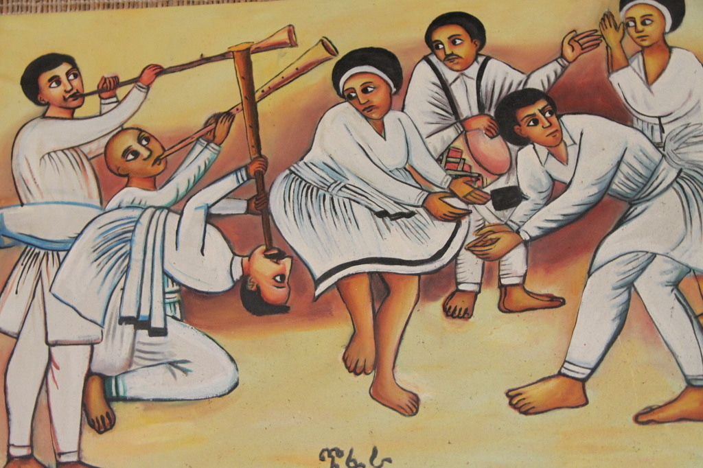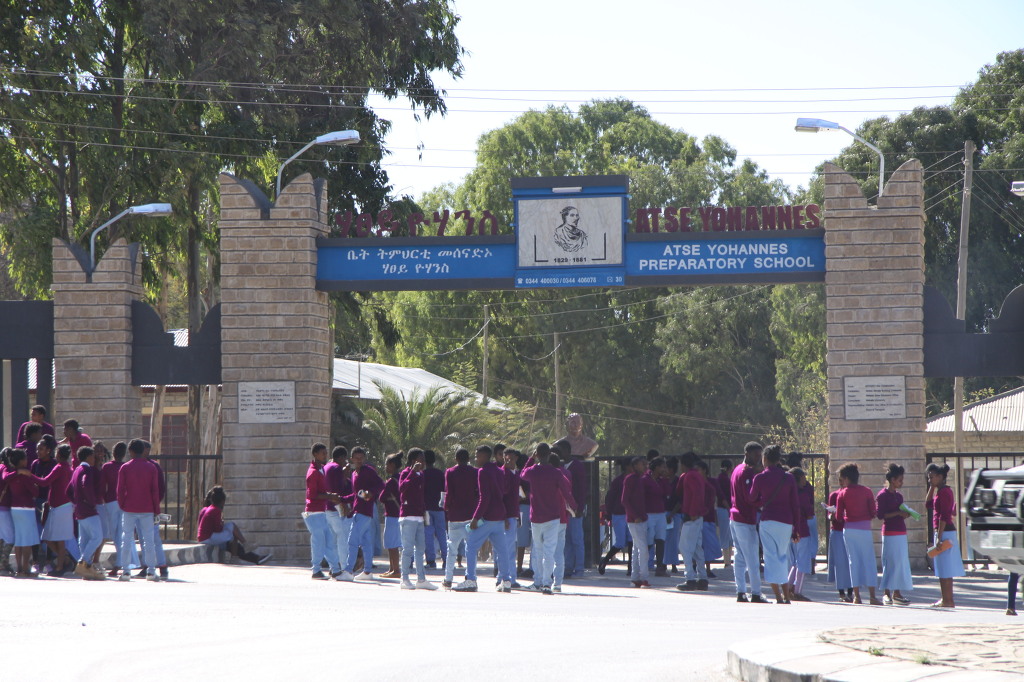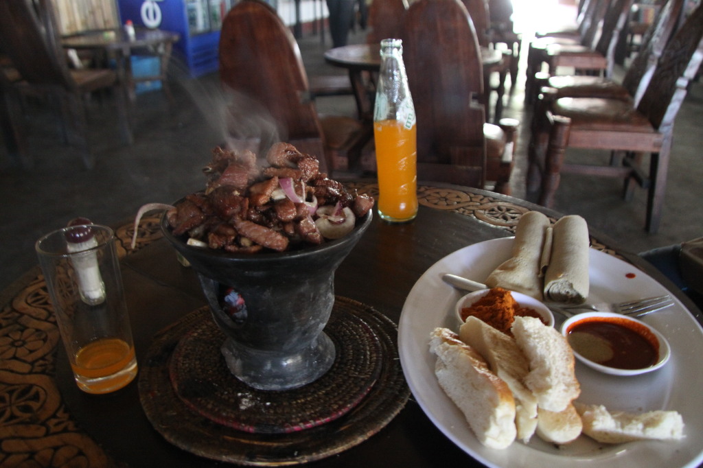 오후 3시가 넘어 ETT 사무실에 도착했다. 신혼부부 샘과도 헤어진다. 일정과 사정이 허락된다면 나미비아에서 만나기로 하고 헤어졌다. 우리는 30분 후에 악숨으로 가는 차를 만나기로 했다. 점심을 먹지 못해 시장하다. 음식점을 추천해 달라고 하니 ETT 사무실 직원이 위치를 알려준다. 걸어갈 거리다. 큰 길을 건너간다. 고등학교 정문에는 교복을 입은 학생들이 가득하다. 연보라색 상의에 하얀색 바지인데, 여학생들은 하얀 치마를 입고 있다. 고등학교 뒤편에 있는 입구는 작고 간판도 허술한데 들어가 보니 홀이 엄청 크고 오래되 보이는 큰 식당이다. 분위기는 천장이 높고 고풍스러운데 약간 어둡다. 벽에는 여러 가지 민속화가 그려져 있다. 유명 칩스 식당이란다. 양고기 500g이 1인분이란다. 1인분만 주문하고 환타를 주문했다. 작은 화로 불에 고기가 구워져 나온다. 거기에 둘둘 말린 인제라와 소스가 있고 빵도 나온다. 고기가 약간 질기지만 참 맛있고 양도 풍성했다. 식당이름을 알아보려고 했는데 모두 에티오피아 글씨로만 적혀 있다.