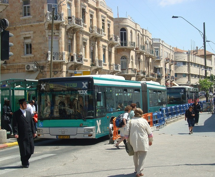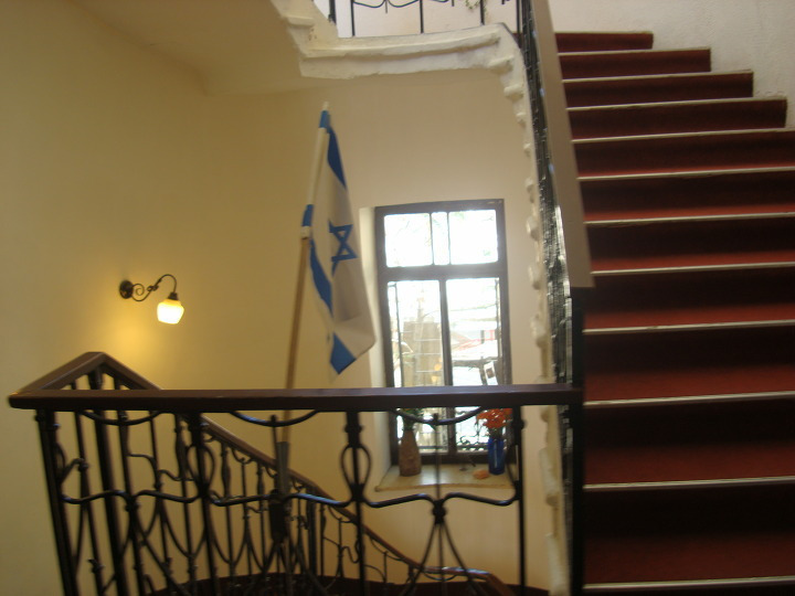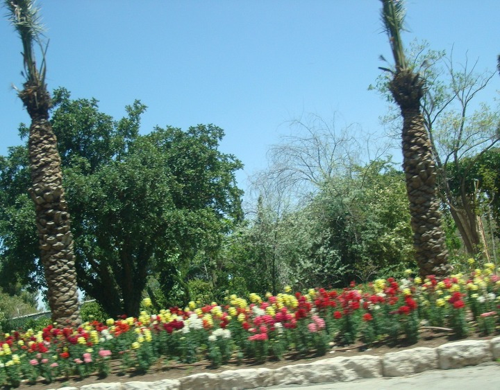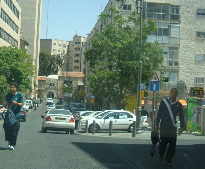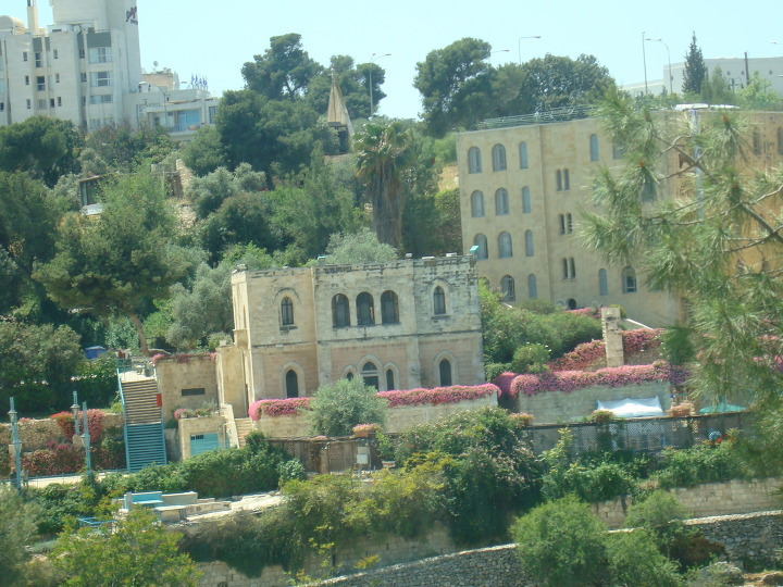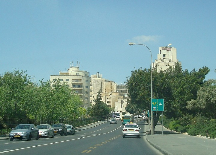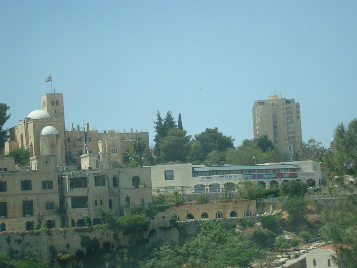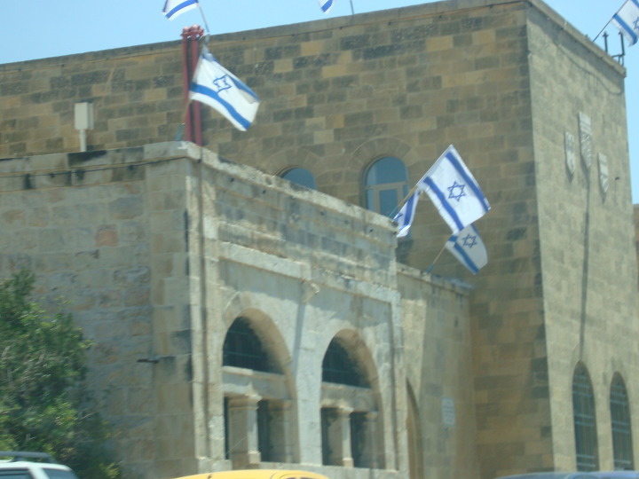 그러고는 나무와 숲이 우거진 신시가지 거리의 여러 건물들을 지나 이스라엘 국기가 걸린