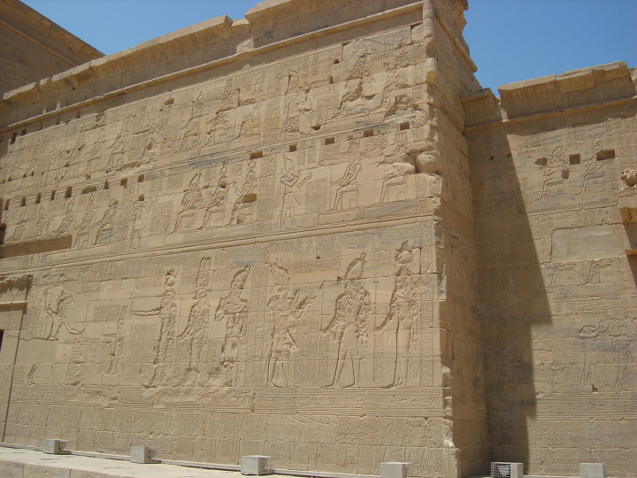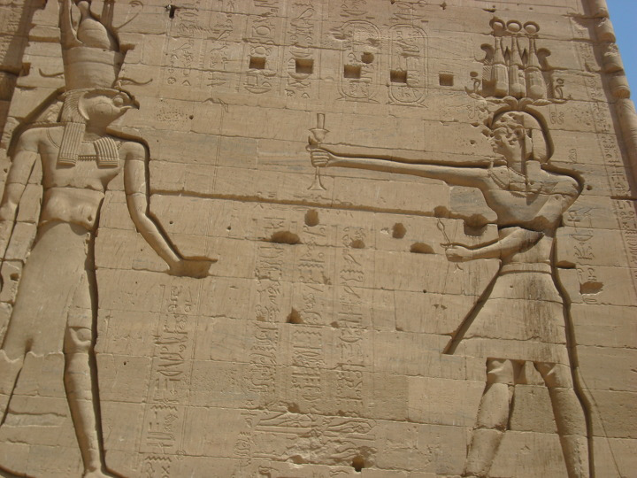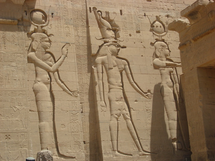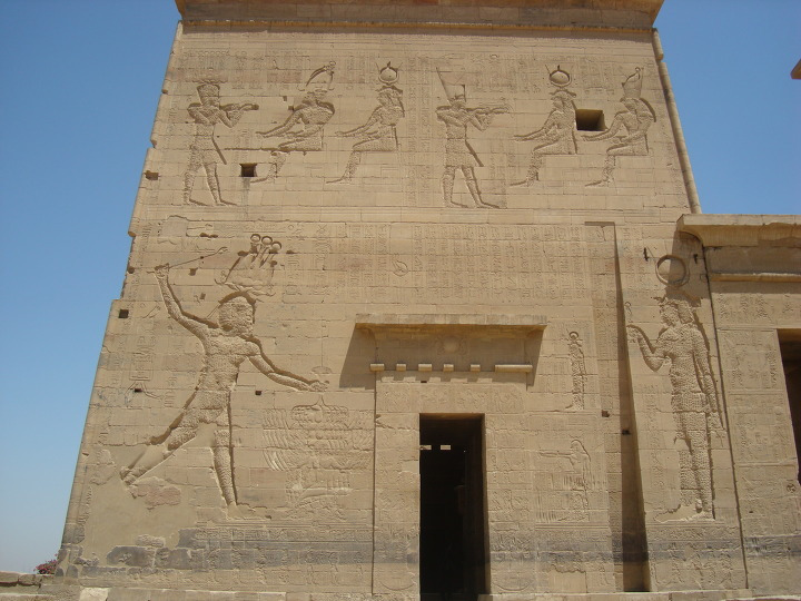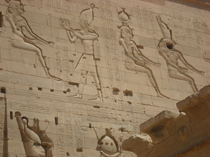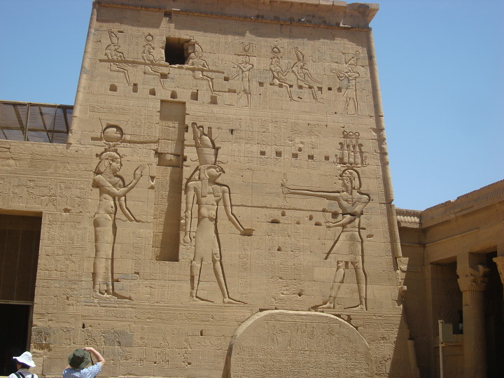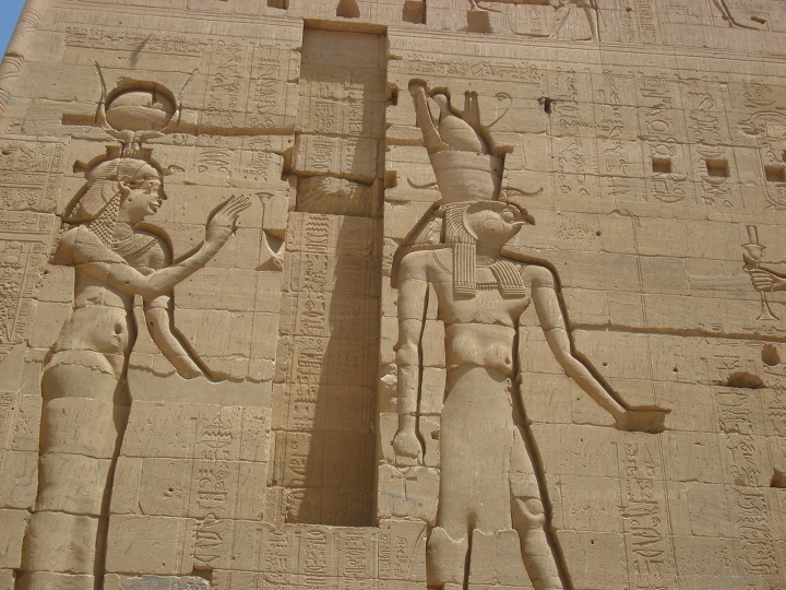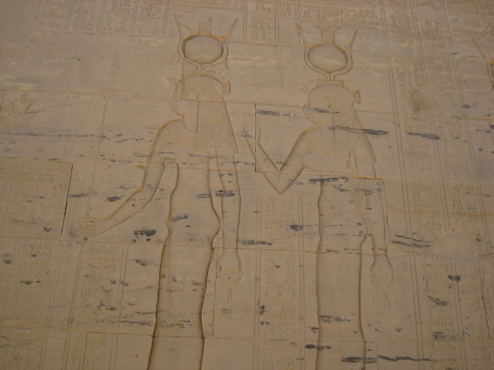 에 건축된 여기 이시스 신전에는 제 1 탑문을 보면 몇몇 신들이 새겨져 있습니다.
