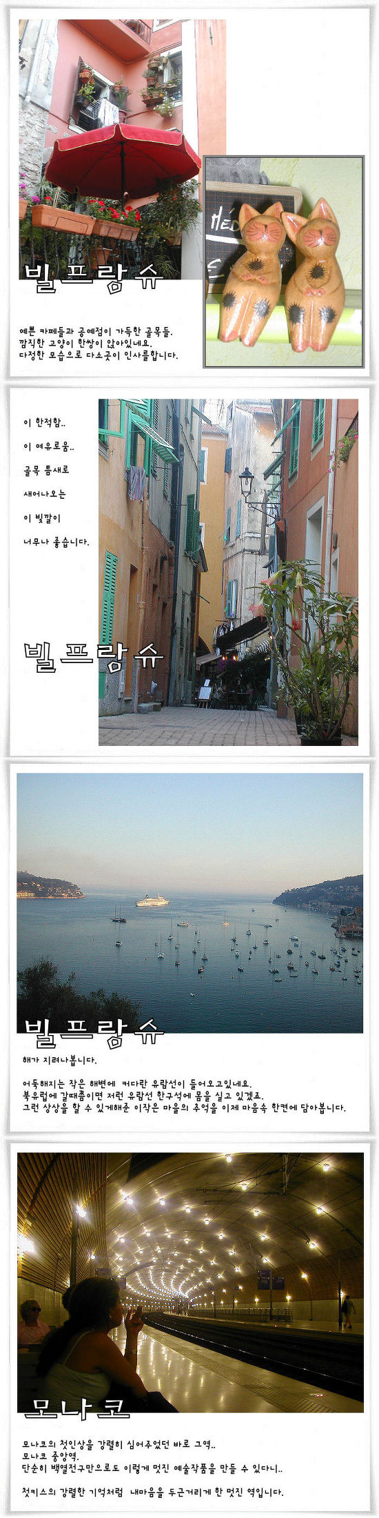 프랑스,모나코 이야기 - 빌프랑슈,모나코 작성자잔디|작성시간10.05.28|조회수357 목록 댓글 5 글자크기 작게가 글자크기 크게가 다른 이야기들 - http://blog.naver.com/freejandi 다음검색 현재 게시글 추가 기능 열기 북마크 공유하기 신고 센터로 신고 댓글 댓글 5 댓글쓰기 답글쓰기 댓글 리스트 작성자마리앙또넷 | 작성시간 10.05.28 모나코 이쁜 곳이네요 ㅎㅎ 아기자기한 곳 ㅎ 답댓글 작성자잔디 작성자 본인 여부 작성자 | 작성시간 10.05.28 네 아기자기한 곳이죠. 동화마을처럼.ㅎ 작성자카페지기 | 작성시간 10.05.30 이쁘고 멋지네요.. 잘봐습니다. 저도 모나코를 못가봐서리.. 답댓글 작성자잔디 작성자 본인 여부 작성자 | 작성시간 10.05.30 네 멋진곳이였어요. 작성자아!가고파 | 작성시간 10.07.16 ~~~~아!가고파라~~~~구경잘했습니다^^^^^ 댓글 전체보기