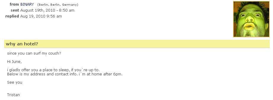 이미 호주에서 몇 번의 카우치서핑을 경험하며 느꼈던 것은, 카우치서핑에 가입한지 얼마 안 된 사람일수록, 그러니까 Reference (프로필에 달리는 평가 정도로 이해하면 편하다.) 가 없는 사람일수록 카우치서핑 요청 승낙 확률이 높다. 물론 이런 경우, 그 사람이 실존하는 사람인지 사이버 프로필만 존재하는지 확인할 수 없다는 단점이 있긴 하다. 베를린의 경우 여행자가 각지에서 엄청 몰리는 도시였고, 카우치서핑을 여기저기 보내봐도 승낙이 잘 안될거 같아 그냥 카우치서핑에 막 가입했던 아줌마한테 요청을 보냈었고 승낙이 되었었다.