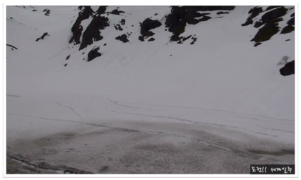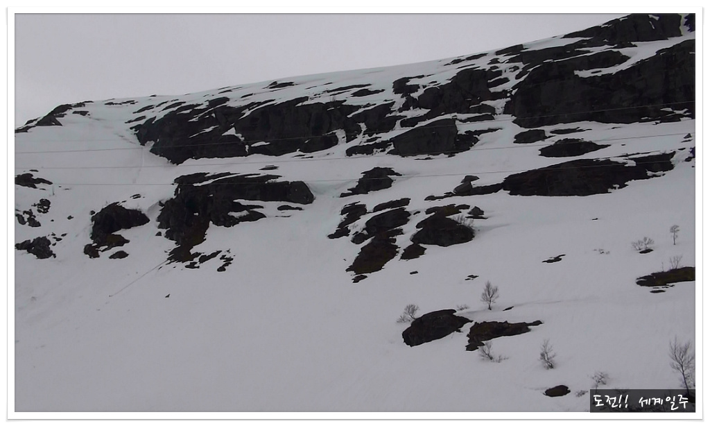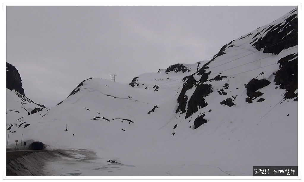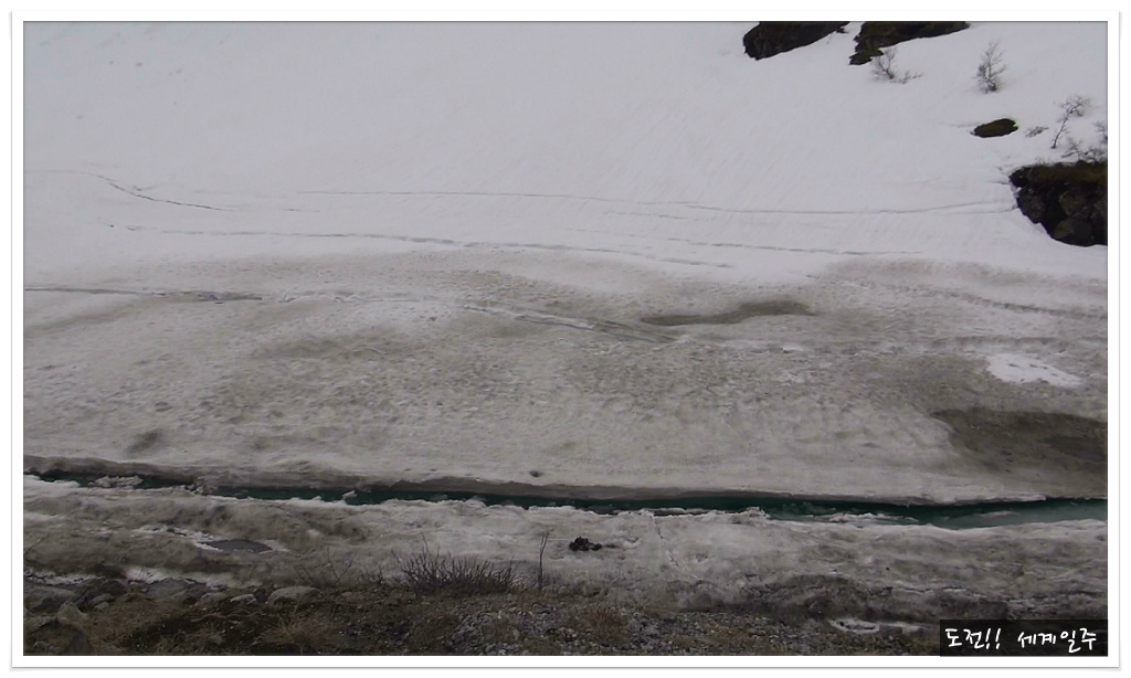 폭포를 지나 얼마나 갔을까?? 이젠 만년설의 세상이 나타난다. 도로만 눈이 없을뿐 사방이 하얀 눈의 나라가 나타난다