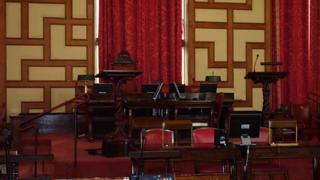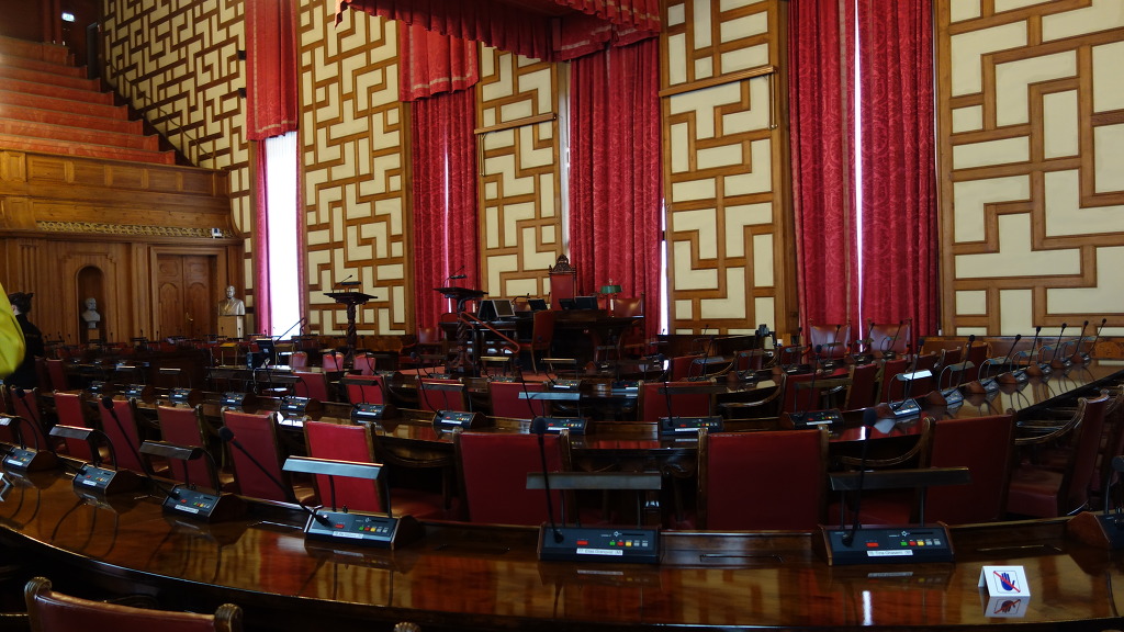 시의회는 격주 월요일에 개최되며 회의 내용은 인터넷과 방송으로 생중계 된다 (의장석과 기록원석)