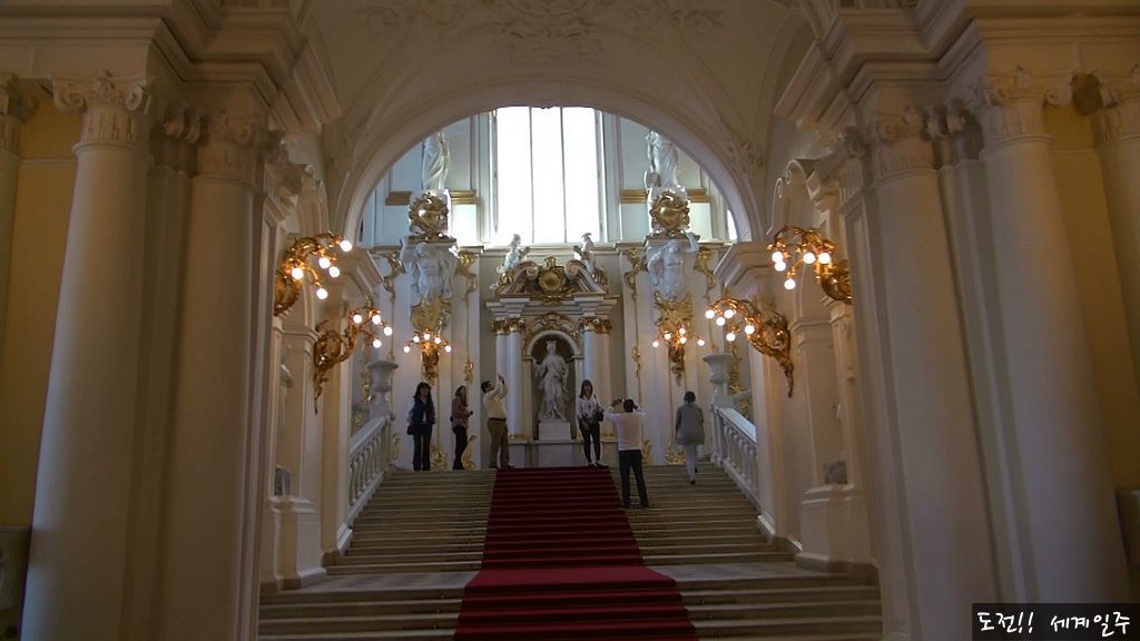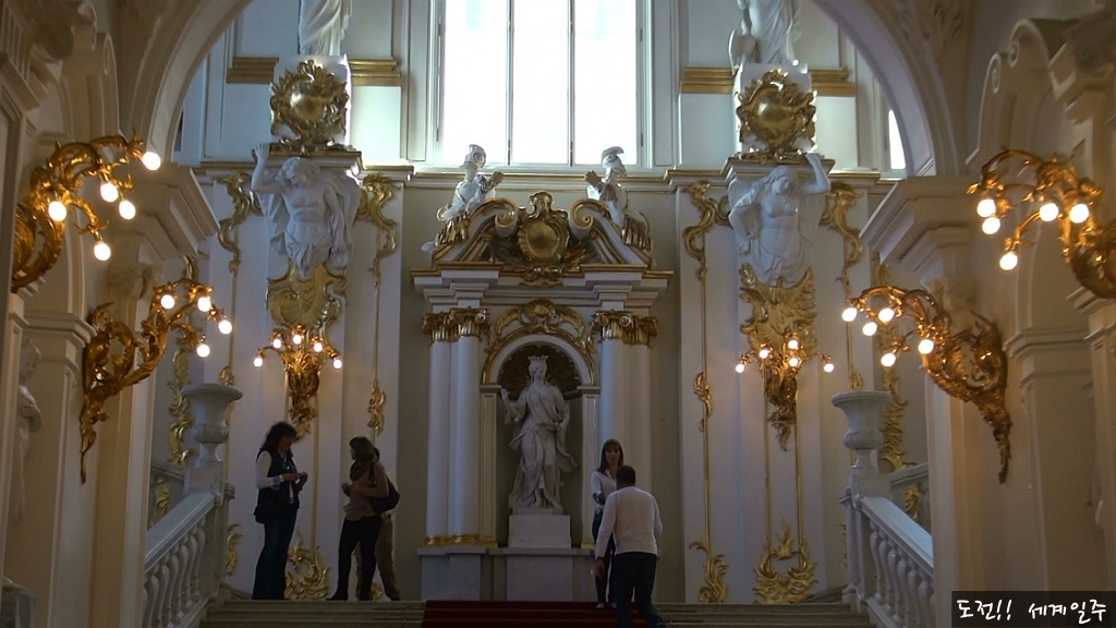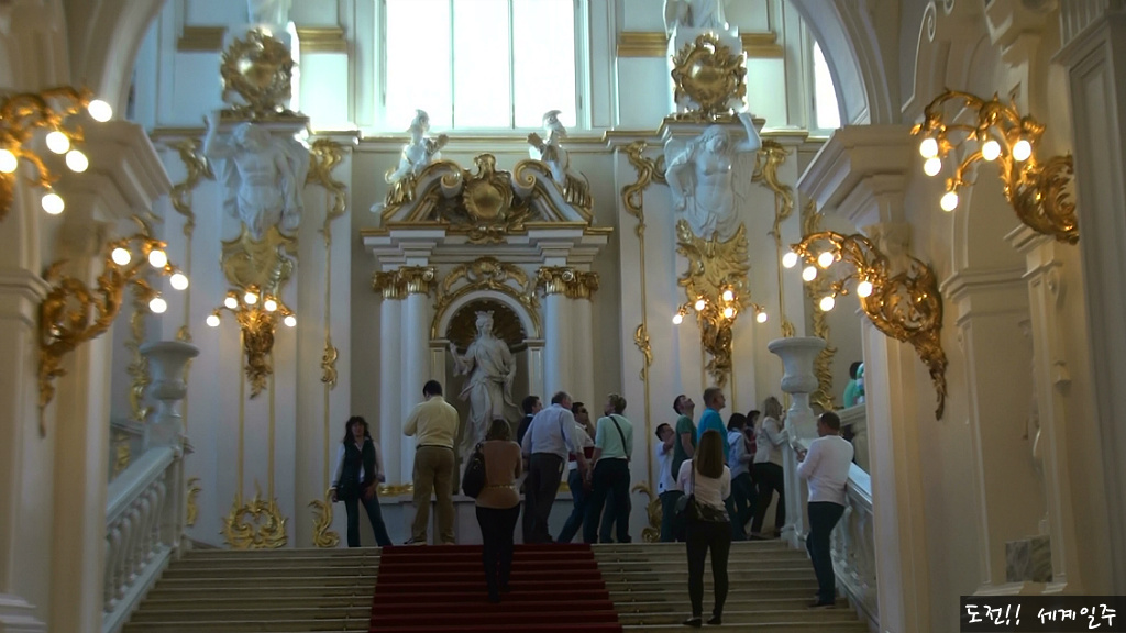 에르미타쥐 박물관 관람이 시작되는 계단에는 붉은 카펫이 깔려있다. 이계단은 외국 대사들이 제정 러시아 시절 황제을 만나기 위해