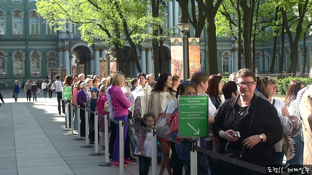 개인 입장객 및 러시아 학생 단체들은 정문을 이용한다. 엄청난 관광객들이 입장권을 사기 위해 줄을 서있다(입장권 10:30 판매)