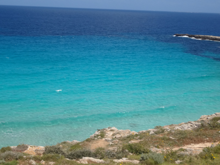 밀밭 펼쳐진 들판을 1시간 20분을 걸어 크리스탈 처럼 투명한 동쪽 바다 Cala Rossa 를 본다.