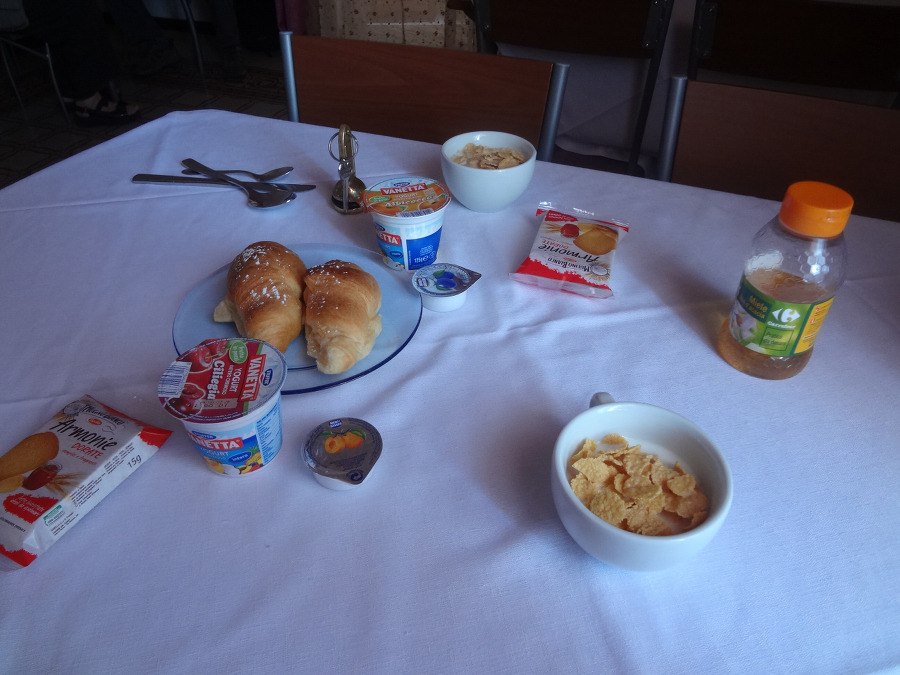 에서 일어나 호텔에서 주는 간단한 아침 식사를 한다.