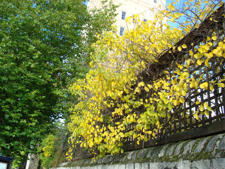대학 담장에 붙은 담쟁이가 꽃을 피워 붉은 모습이 인상적인 데, 여기 골목길은 바닥에