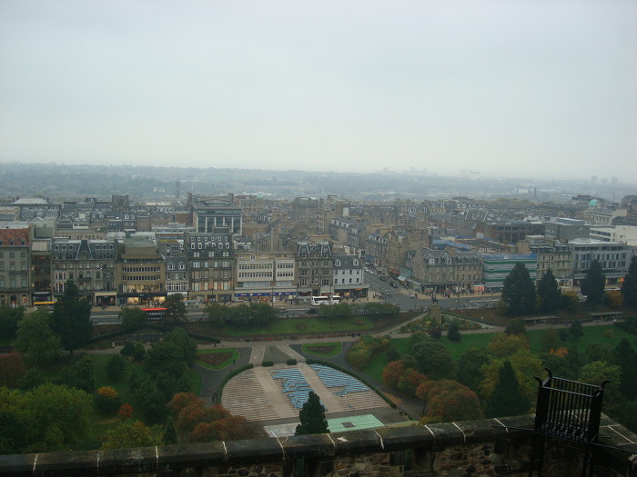 에든버러 성 에 이르러 광장에서 오른쪽 언덕 아래를 바라보니 아름다운 정원 속에