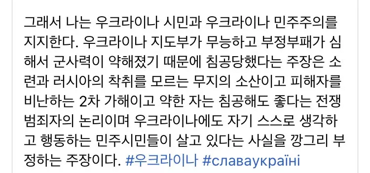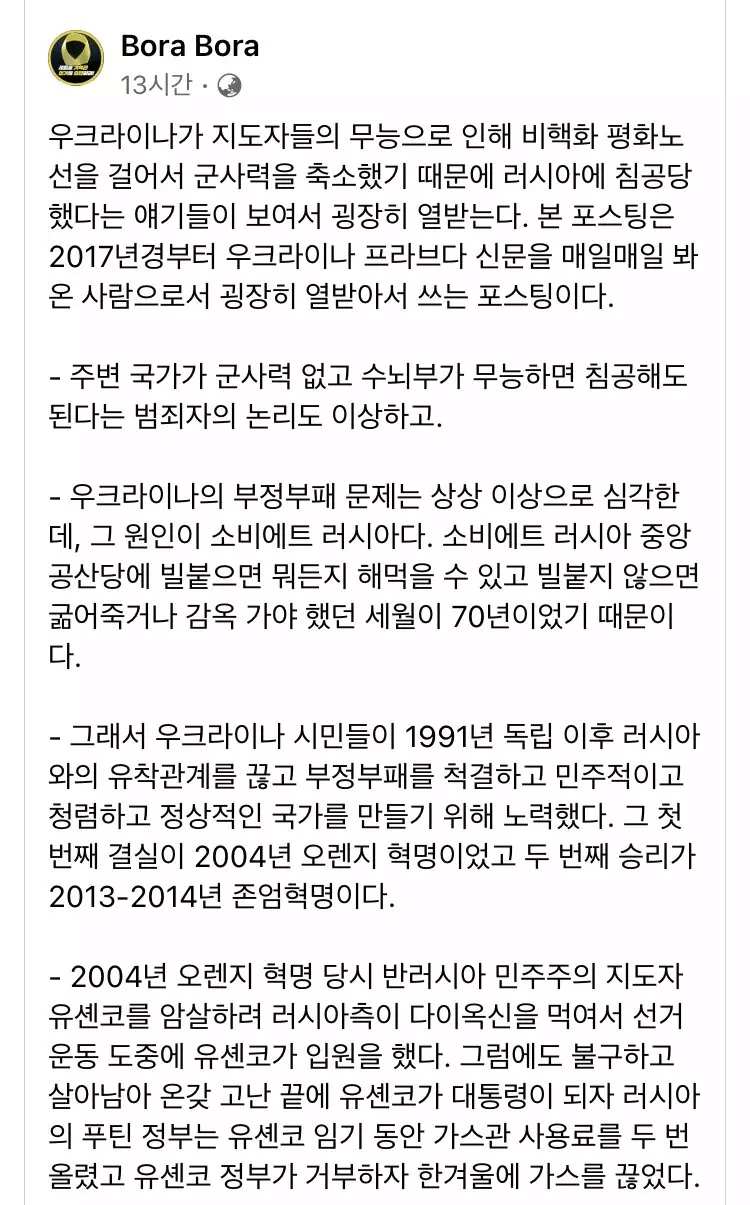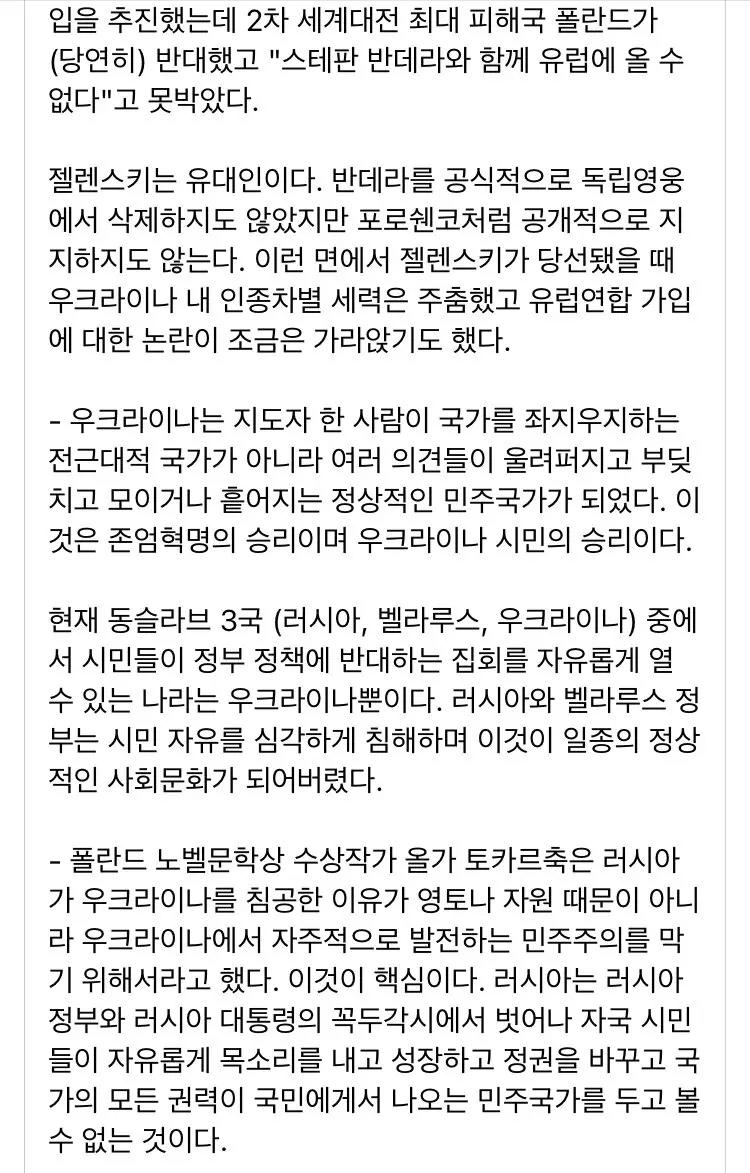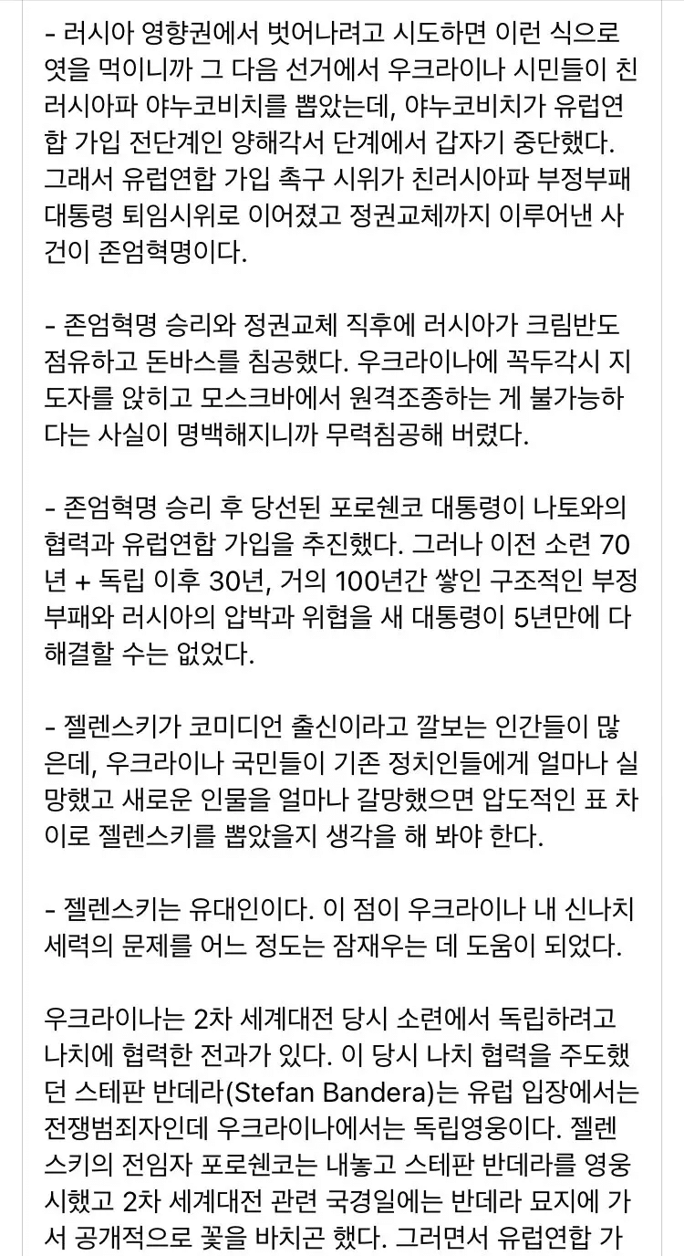 [스크랩] 우크라이나의 정치적 상황에 대한 이해를 도와주는 글 작성자카페여행|작성시간22.02.26|조회수62 목록 댓글 0 글자크기 작게가 글자크기 크게가 소울드레서는 우리가 만들어가는 소중한 공간입니다.댓글 작성시 타인에 대한 배려와 책임을 다해주세요.https://youtu.be/lD76TZCgoSE?t=11493https://youtu.be/LCeMW3aAsro 다음검색 스크랩 원문 : 소울드레서 (SoulDresser) 현재 게시글 추가 기능 열기 북마크 공유하기 신고 센터로 신고 댓글 댓글 0 댓글쓰기 답글쓰기 댓글 리스트
