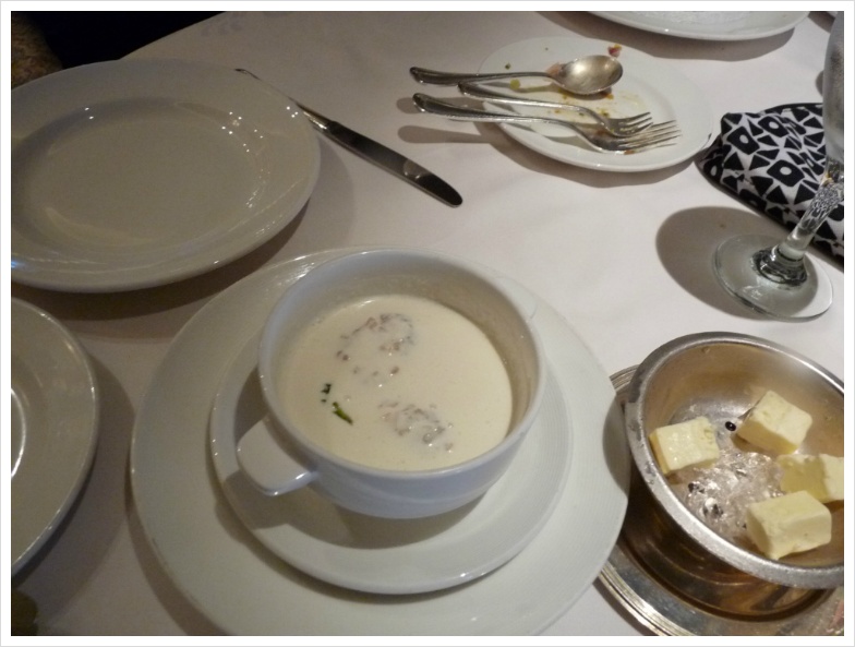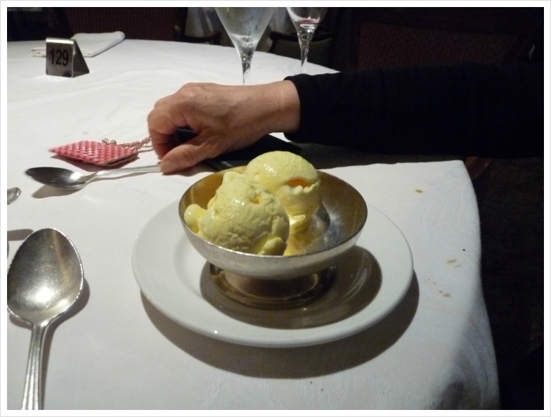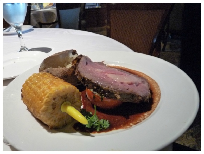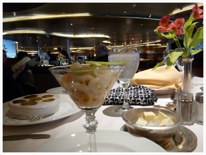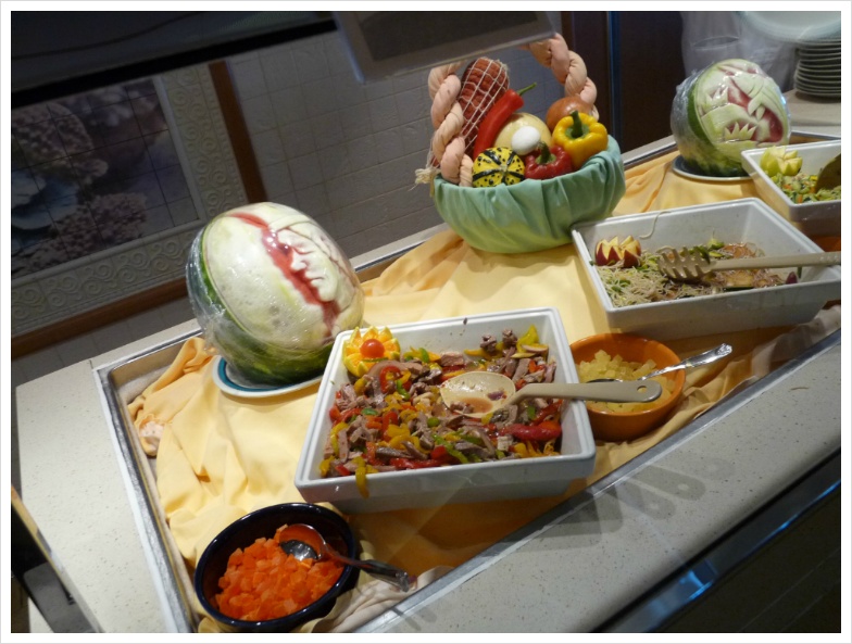 매일 매일 제공되는 신선한 과일, 이름도 못 들어본 산해진미... 뭐 이런 식으로 축약하면 대략 이야기가 되겠지만, 정찬은 비교적 '트래디셔널' 한 코스 요리가 제공되는 것이고, 부페는 조금씩 메뉴가 바뀌긴 하지만 기본적으로는 거의 같습니다. 한편 이런 쪽에조차 식상한 사람들을 위해 이 크루즈 배 안에서는 25달러의 커버 차지를 따로 받는 스테이크 하우스가 별도로 있기도 합니다. 과거엔 아마 이 정도의 구별은 두지 않았을테지만, 시끄러운 거 싫어하고 비교적 입맛이 까다롭고, 그리고 무엇보다 돈이 넘쳐나는 사람들은 자기들의 공간을 배 안에서도 따로 쓰는 셈입니다.