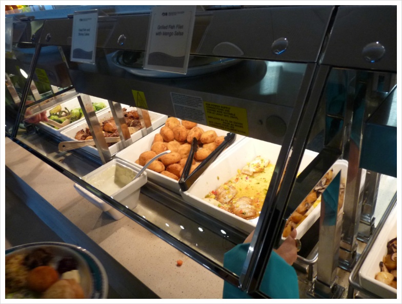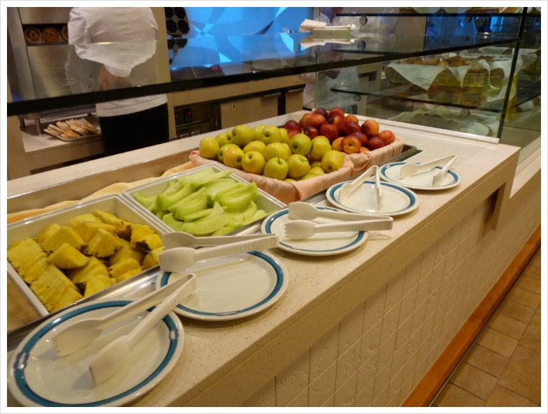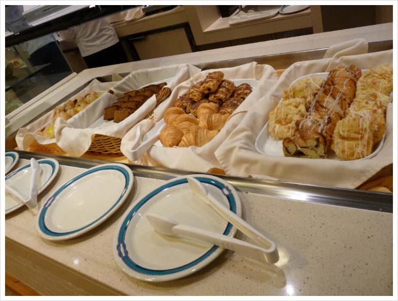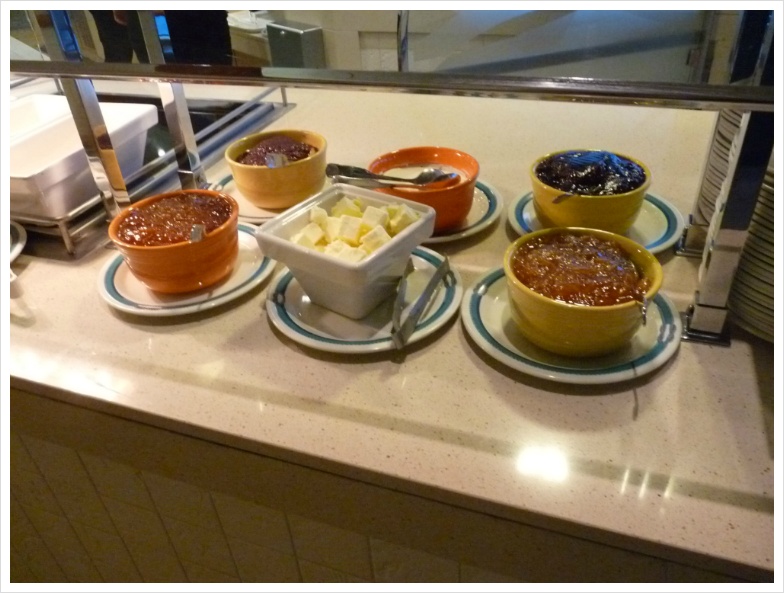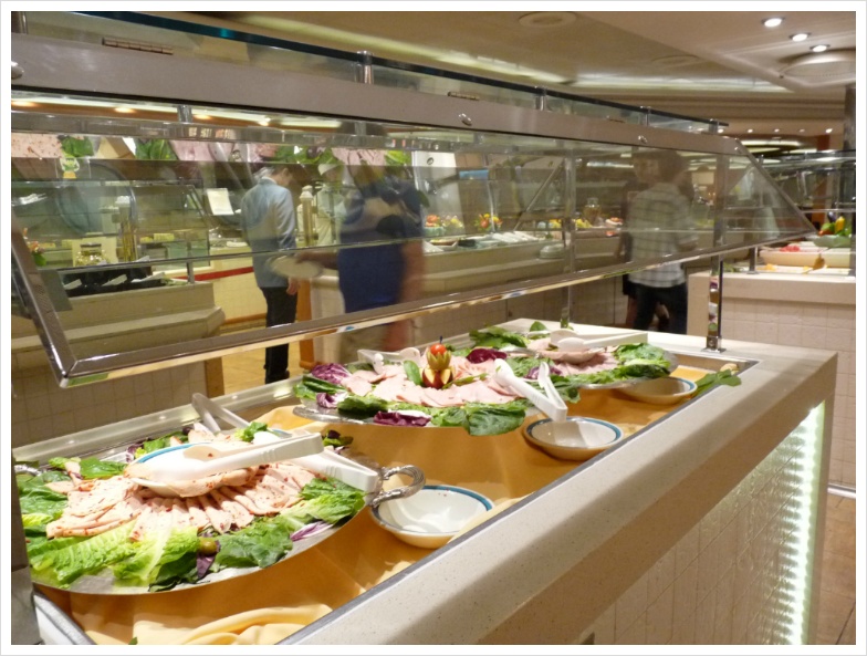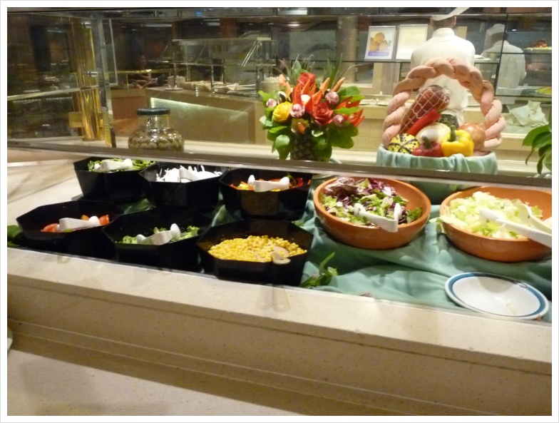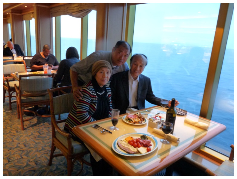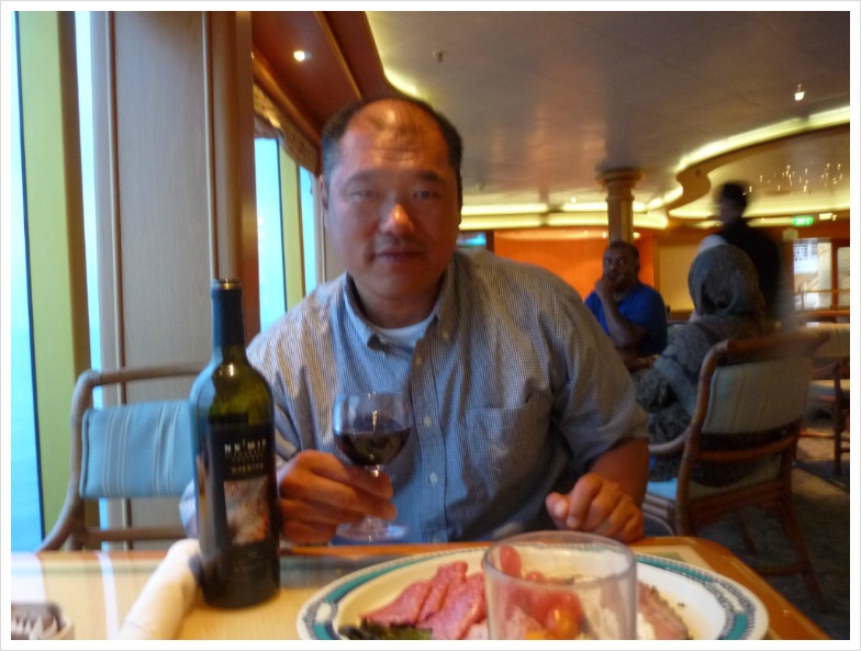 와인을 가져가면 정찬 식당에서는 병당 15달러라는 만만치 않은 코키지를 무는데(카니발 크루즈에서는 병당 10달러 물었었는데...) 수정씨는 제게 미리 와인을 따서, 약간 비워서 '부페 식당으로 가져올 것'을 알려주었습니다. 그러면 자기가 와인 잔을 갖다 주겠다고 하더군요. 덕분에 저는 그 코키지를 물지 않고 부페 식당의 특히 와인과 어울리는 요리들을 담아 와서 즐겼습니다. 아무튼, 이렇게 '먹는 즐거움, 마시는 즐거움'은 크루즈 여행의 백미라 할 수 있겠지만, 양조절 제대로 못하면 살 쪄서 돌아오는 건 지극히 당연한 일입니다.